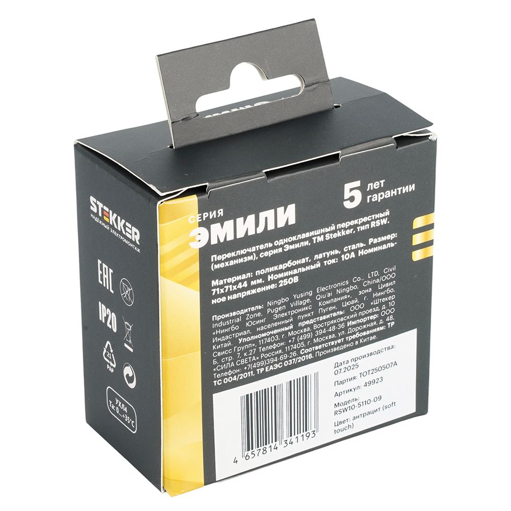 Выключатели одноклавишный STEKKER RSW10-5110-09, серия Эмили тип установки - скрытый, размер изделия 71*71*40мм., цвет антрацит, soft touch, материал изделия поликарбонат, латунь, сталь. Номинальное напряжение 250 , номинальный ток 10А, 20