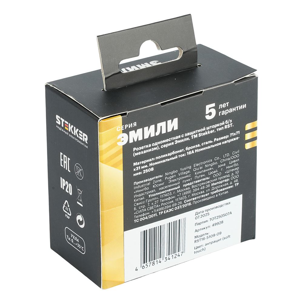 Розетка STEKKER RST10-5109-09 (срок службы 25 лет) на 1 гнездо, -, без заземления. Материал: поликарбонат, бронза, сталь, цвет антрацит, soft touch, размер 71*71*31мм. Номинальное напряжение 250, номинальный ток 16А, диапазон рабочих температур 0..+35°C, 20