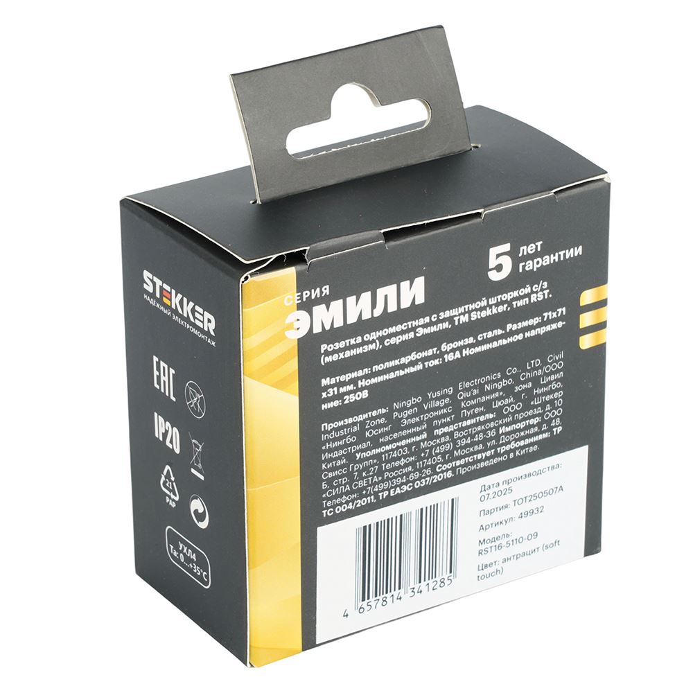 Розетка STEKKER RST16-5110-09 (срок службы 25 лет) на 1 гнездо, -, с заземлением. Материал: поликарбонат, бронза, сталь, цвет антрацит, soft touch, размер 71*71*40мм. Номинальное напряжение 250, номинальный ток 16А, диапазон рабочих температур 0..+35°C, 20