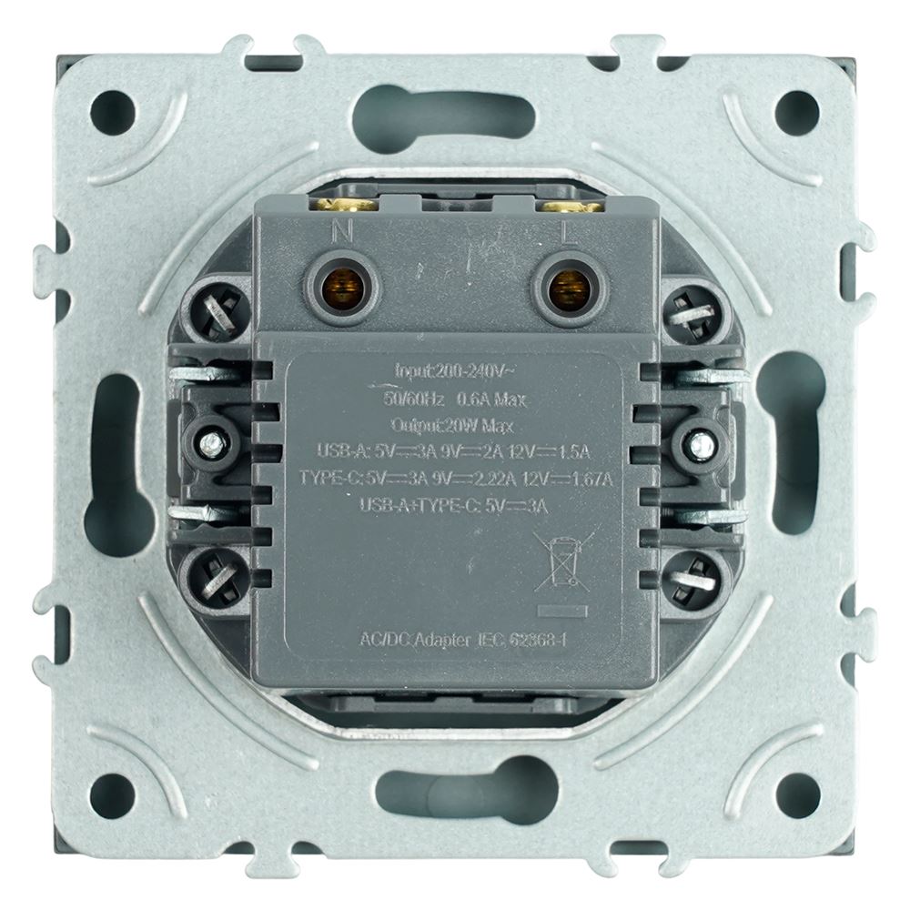 Розетка STEKKER RST10-5115-09 (USB-A: 12В 1,5А/9В 2А/5В 3А USB-C: 12В 1,67А/9В 2.22А/5В 3А, срок службы 25 лет) на USB Type A + Type C гнездо, -, -....