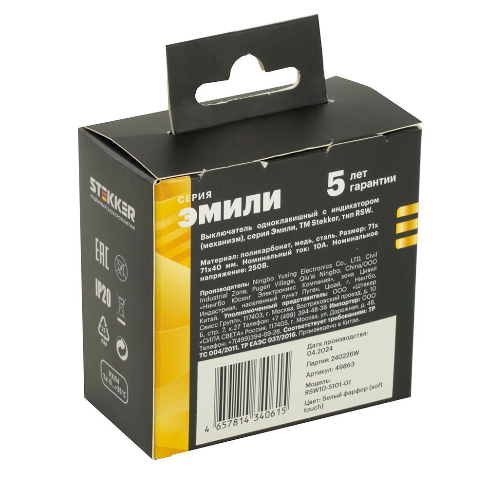 Выключатели одноклавишный STEKKER RSW10-5101-01, серия Эмили, с подсветкой (белый), тип установки - скрытый, размер изделия 71*71*40мм., цвет белый фарфор, soft touch, материал изделия поликарбонат, латунь, сталь. Номинальное напряжение 250 , номинальный ток 10А, 20