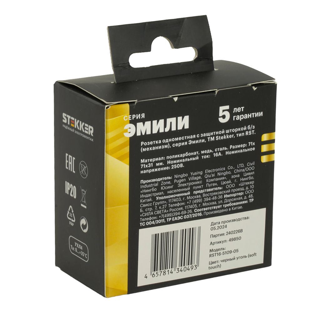 Розетка STEKKER RST16-5109-05 (срок службы 25 лет) на 1 гнездо, -, без заземления. Материал: поликарбонат, бронза, сталь, цвет черный уголь, soft touch, размер 71*71*31мм. Номинальное напряжение 250, номинальный ток 16А, диапазон рабочих температур 0..+35°C, 20
