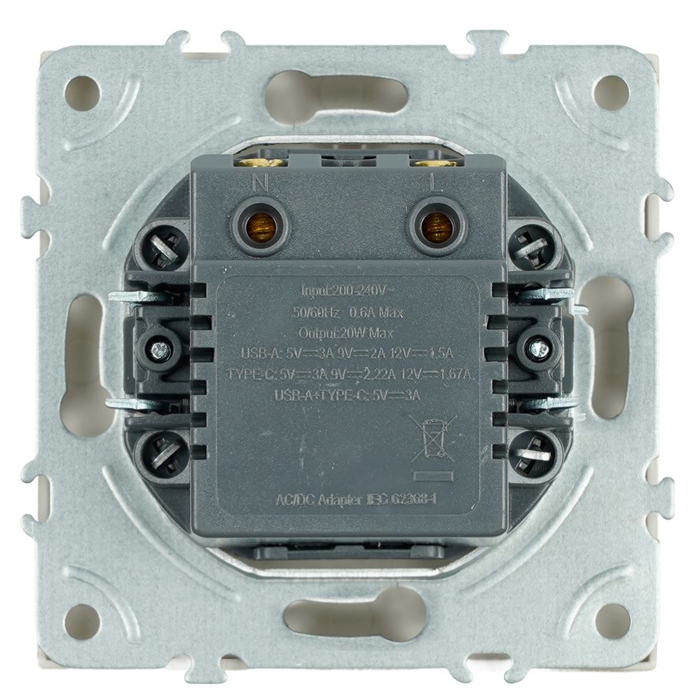 Розетка STEKKER RST10-5115-08 (USB-A: 12В 1,5А/9В 2А/5В 3А¶USB-C: 12В 1,67А/9В 2.22А/5В 3А, срок службы 25 лет) на USB Type A + Type C гнездо, -, -....