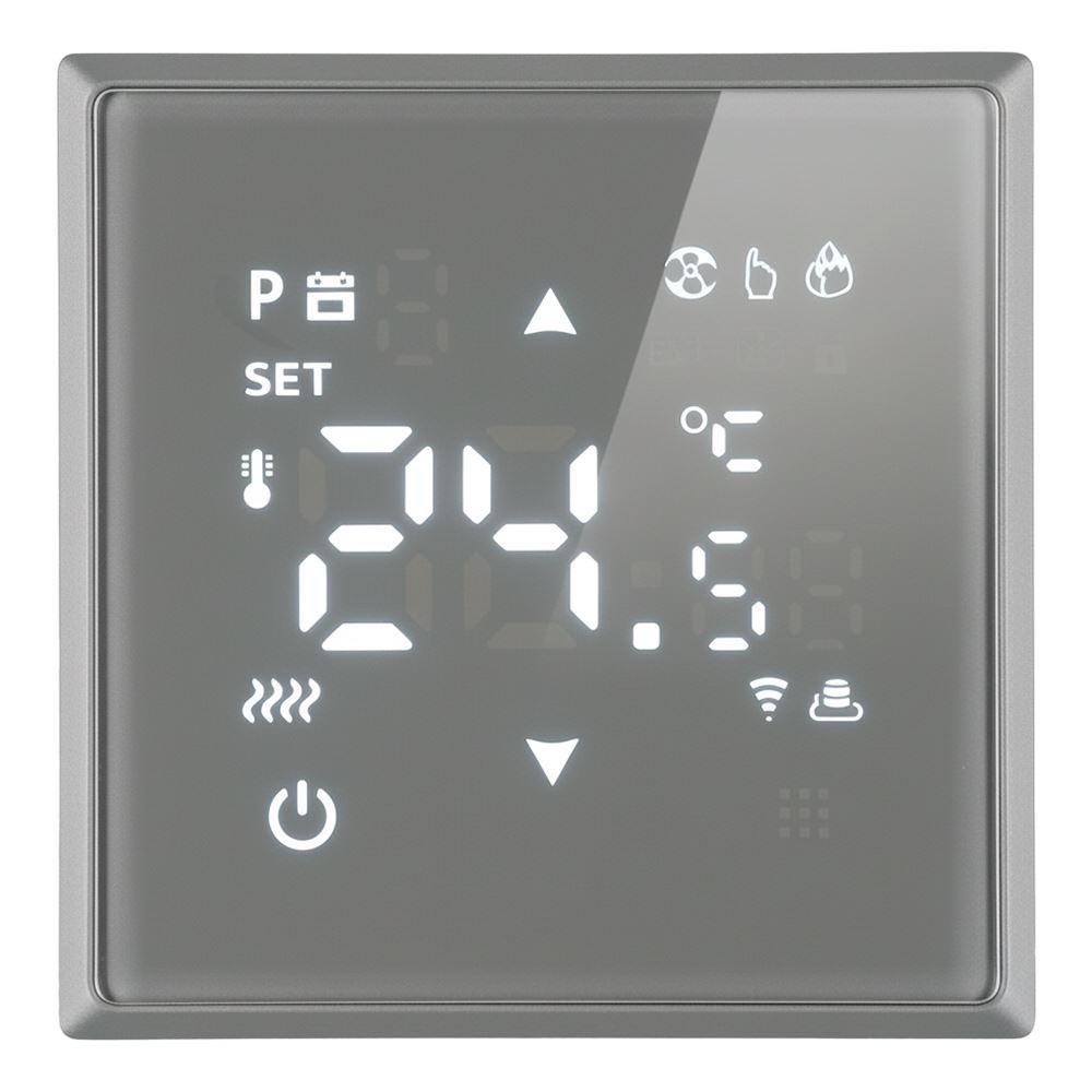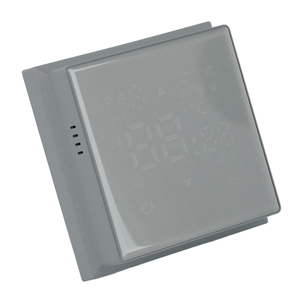 Терморегулятор сенсорный STEKKER RSW00-5119-10, серия Эмили, с подсветкой (белый), тип установки - скрытый, размер изделия 71*71*46мм., цвет платиново-серый, soft touch, материал изделия ABS пластик, латунь. Номинальное напряжение 250 , номинальный ток 16А, IP20