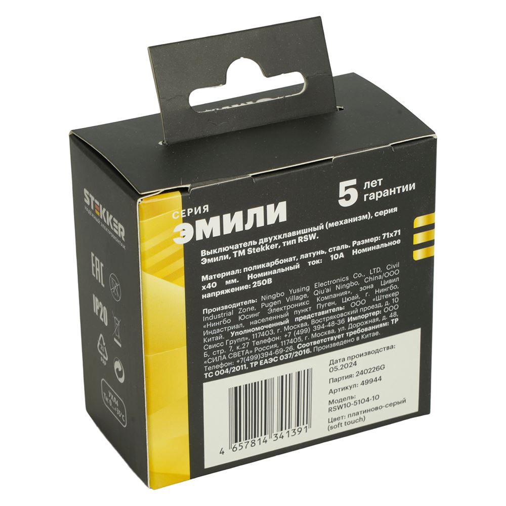 Выключатели двухклавишный STEKKER RSW10-5104-10 , серия Эмили тип установки - скрытый, размер изделия 71*71*40мм., цвет платиново-серый, soft touch, материал изделия поликарбонат, латунь, сталь. Номинальное напряжение 250 , номинальный ток 10А, 20