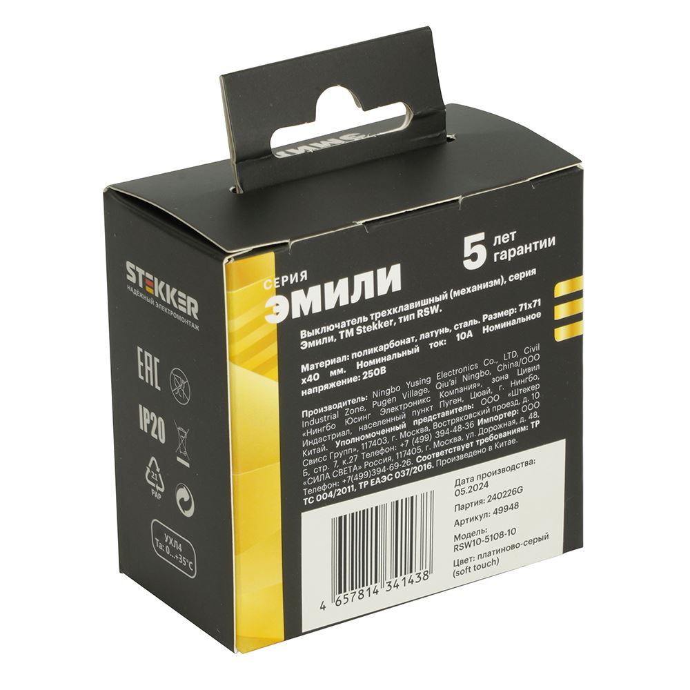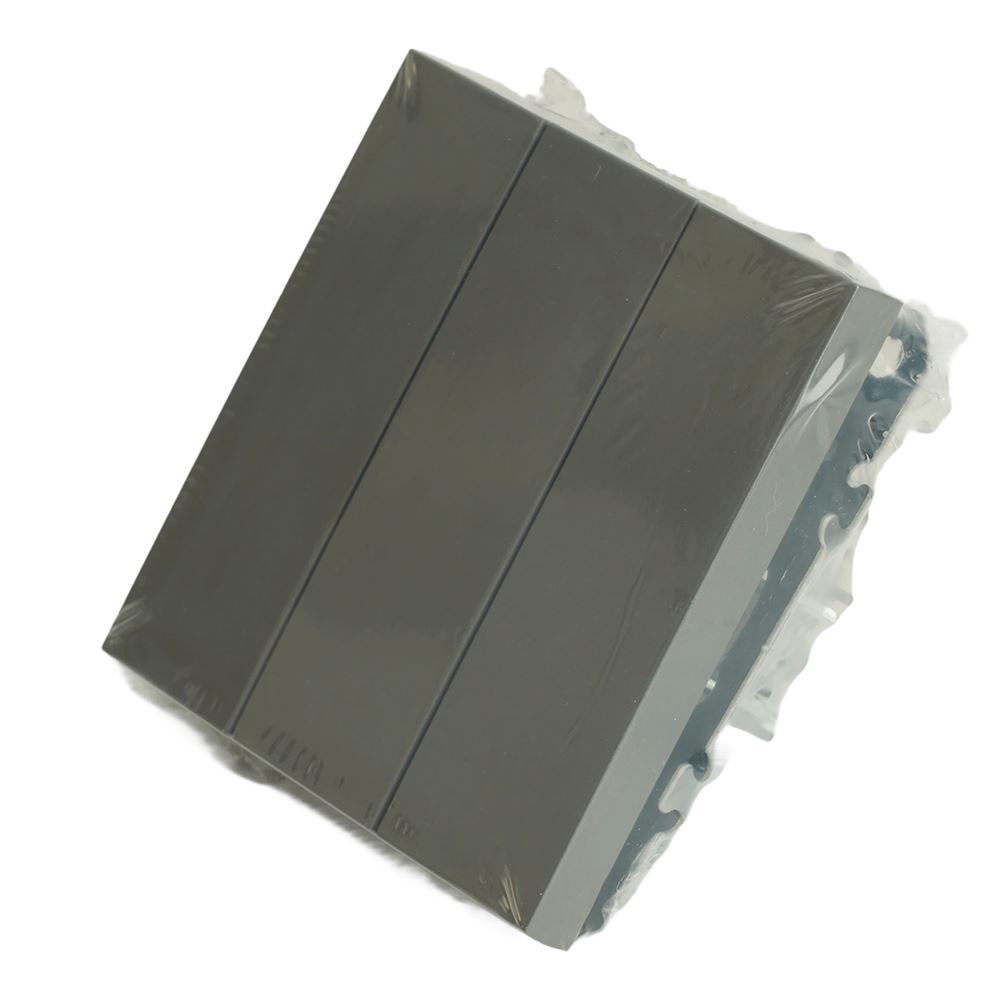 Выключатели трехклавишный STEKKER RSW10-5108-10, серия Эмили тип установки - скрытый, размер изделия 71*71*40мм., цвет платиново-серый, soft touch, материал изделия поликарбонат, латунь, сталь. Номинальное напряжение 250 , номинальный ток 10А, 20