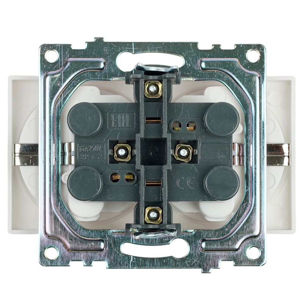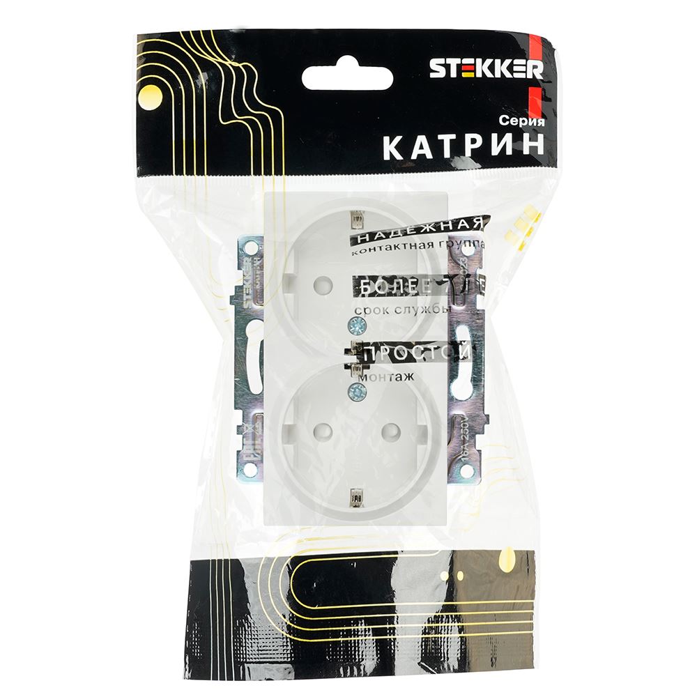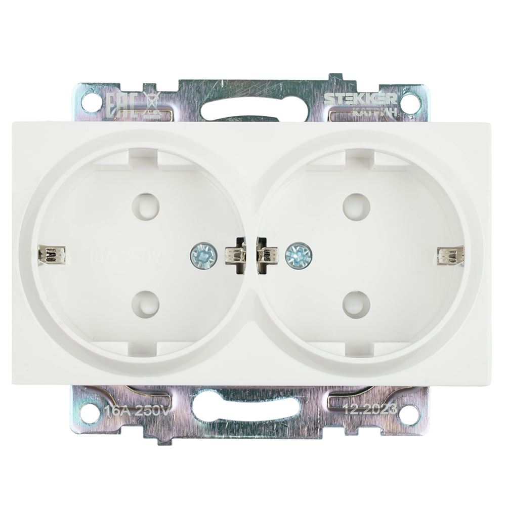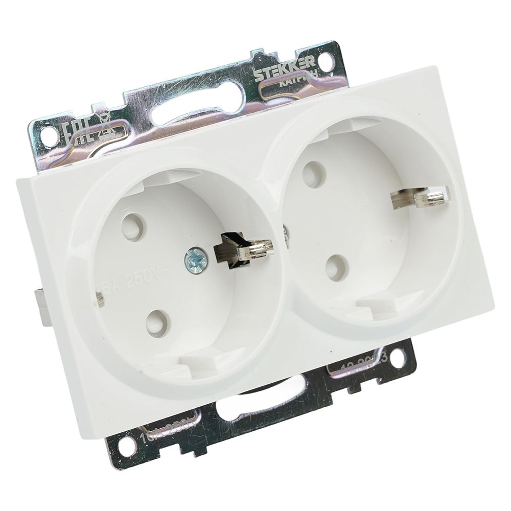 Розетка STEKKER GLS16-7114-01 на 2 гнездо, с заземлением. Материал: ABS пластик, латунь, цвет белый, размер 91*72*43мм. Номинальное напряжение 250, номинальный ток 16А, диапазон рабочих температур 0..+35°C, IP20
