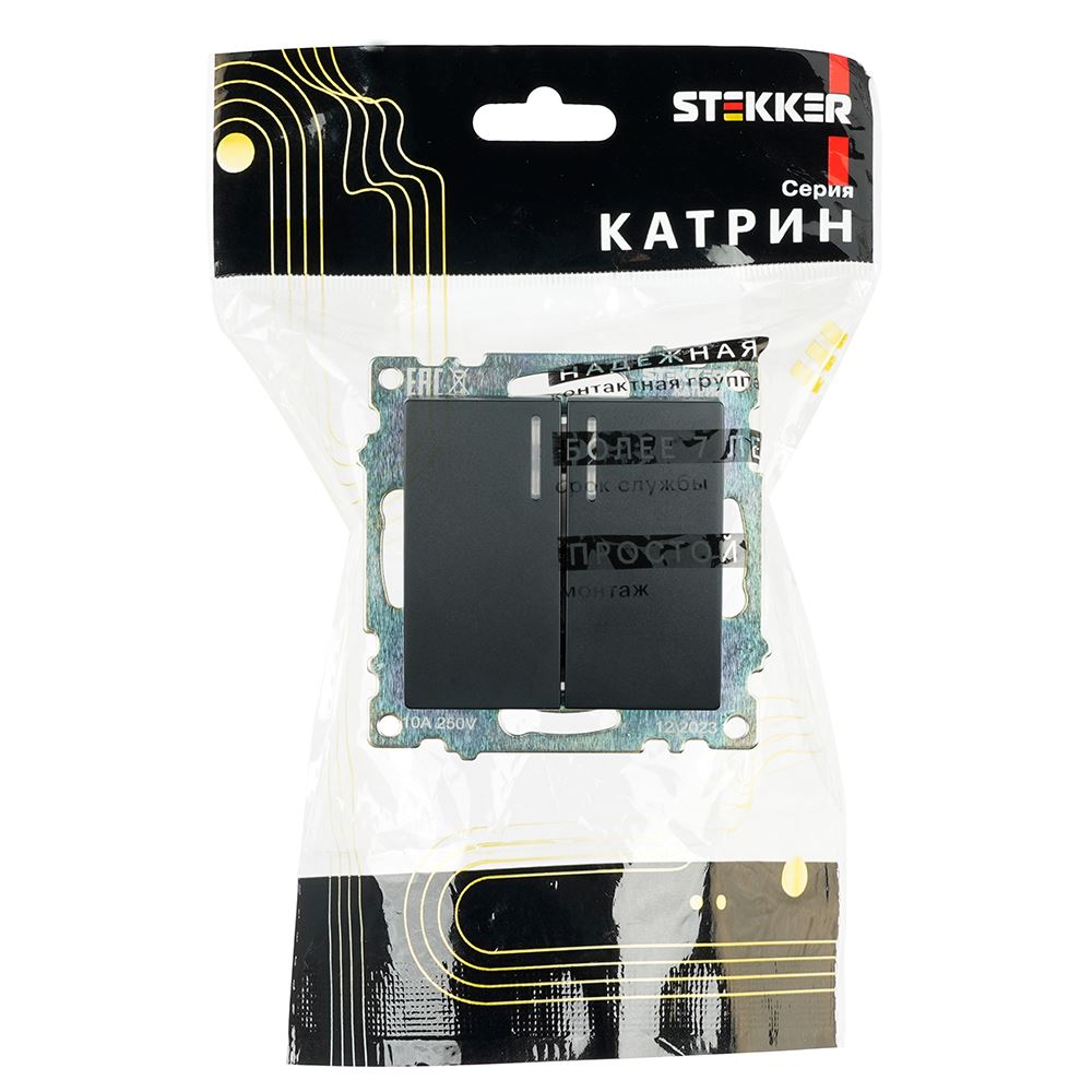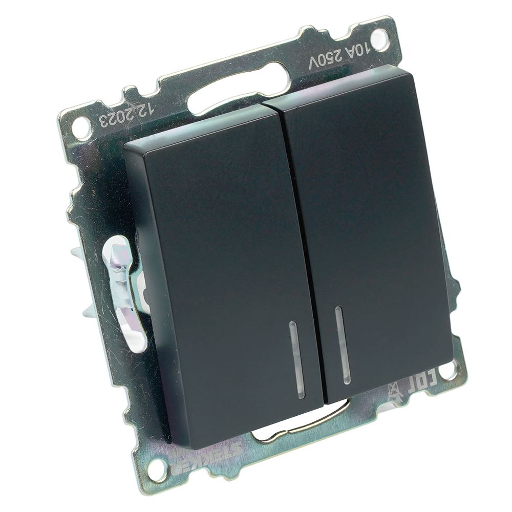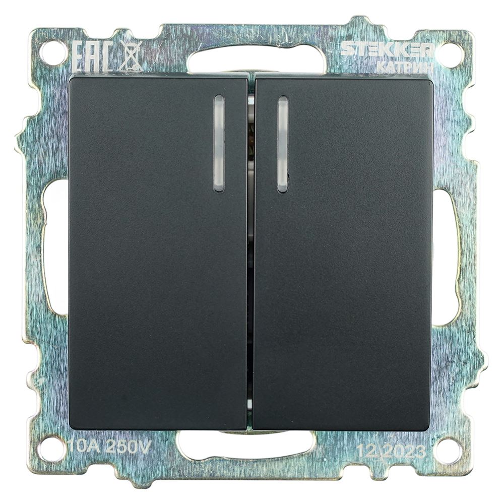 Выключатели двухклавишный STEKKER GLS10-7102-05, серия Катрин, с подсветкой (желтый), тип установки - скрытый, размер изделия 72*72*35мм., цвет черный, материал изделия поликарбонат, латунь. Номинальное напряжение 250 , номинальный ток 10А, IP20