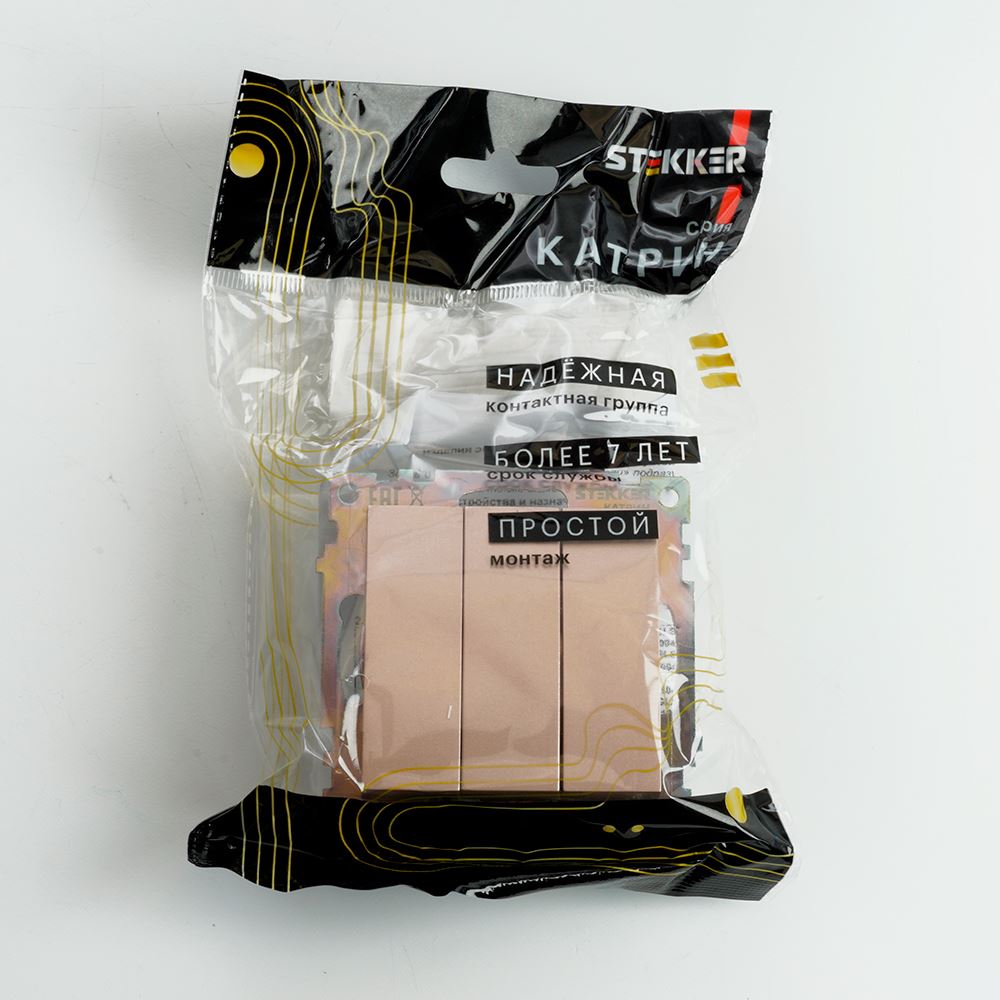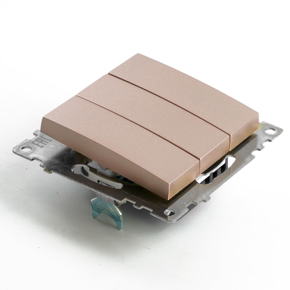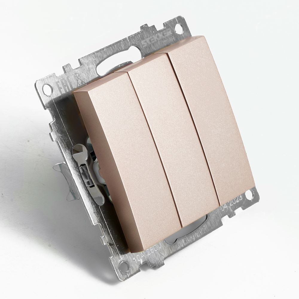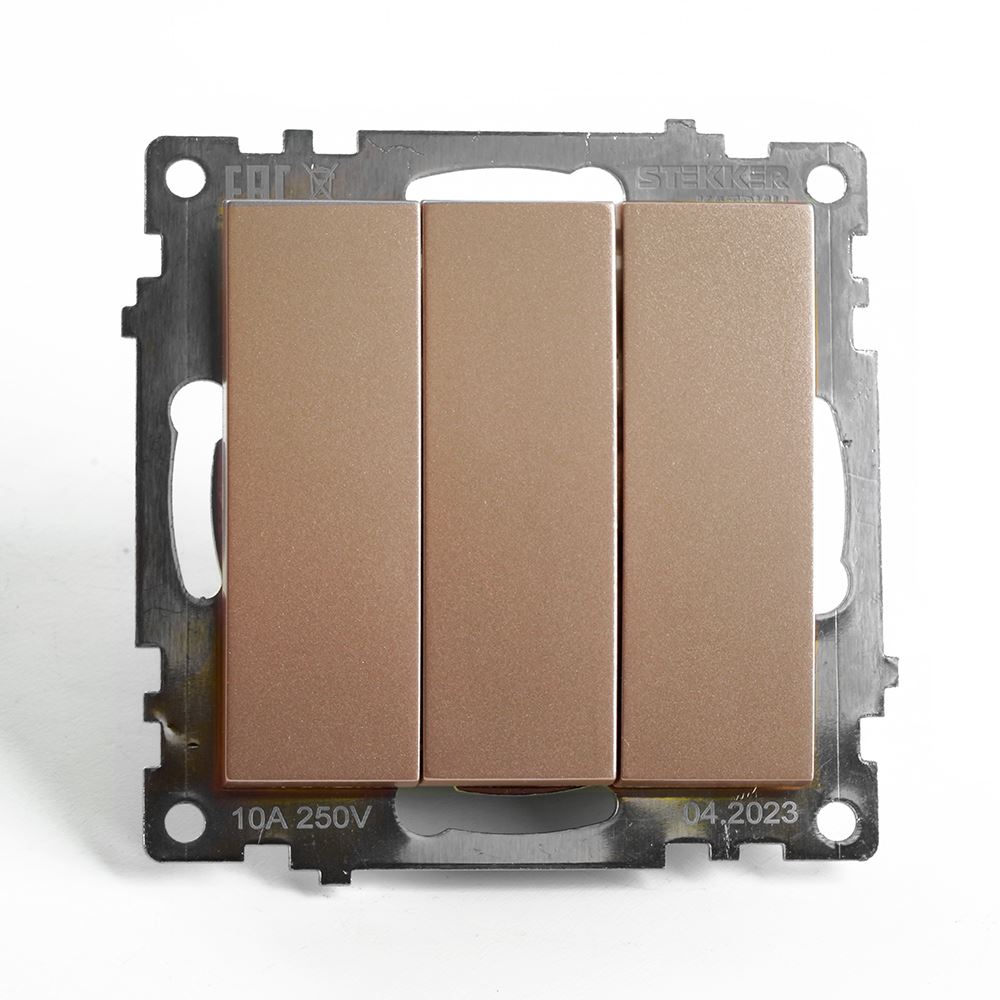 Выключатели трехклавишный STEKKER GLS10-7108-02, серия Катрин тип установки - скрытый, размер изделия 72*72*35мм., цвет шампань, материал изделия поликарбонат, латунь. Номинальное напряжение 250 , номинальный ток 10А, IP20