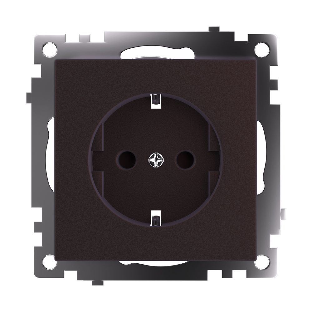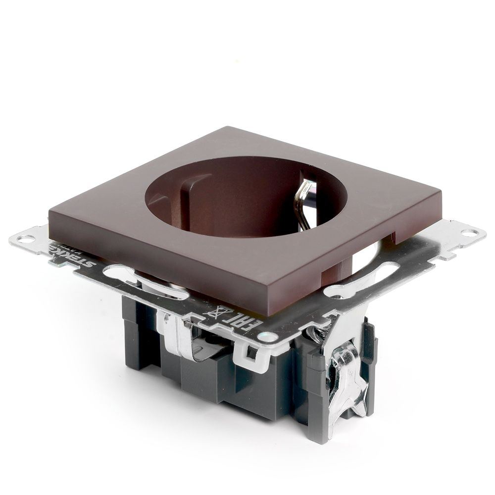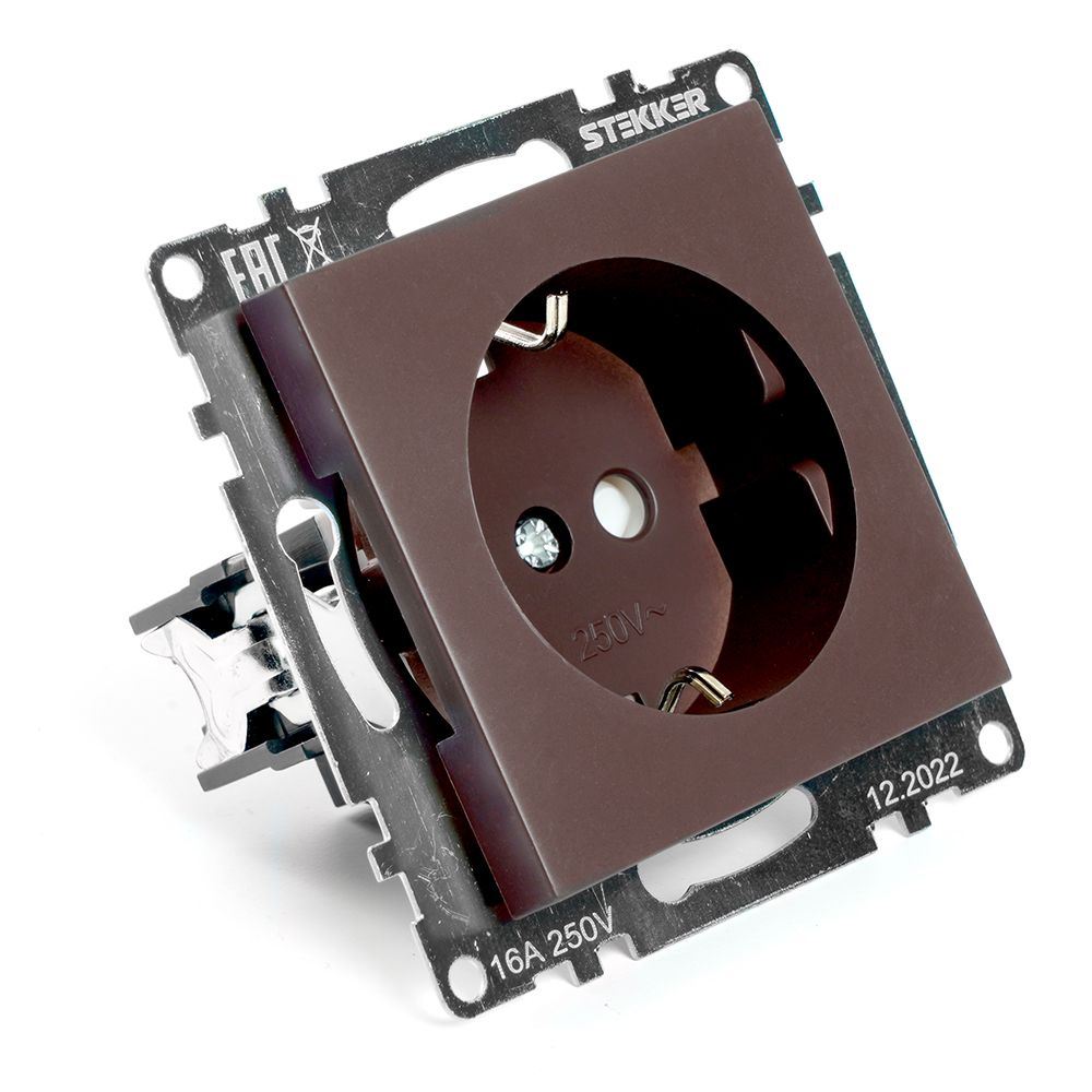 Розетка STEKKER GLS16-7110-04 на 1 гнездо, с заземлением. Материал: поликарбонат, латунь, цвет шоколад, размер 72*72*43мм. Номинальное напряжение 250, номинальный ток 16А, диапазон рабочих температур 0..+35°C, IP20