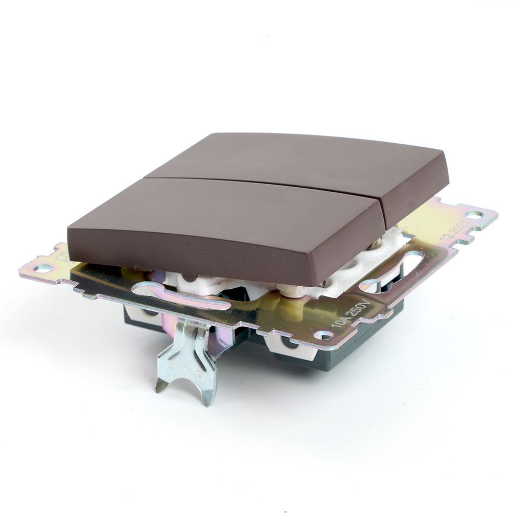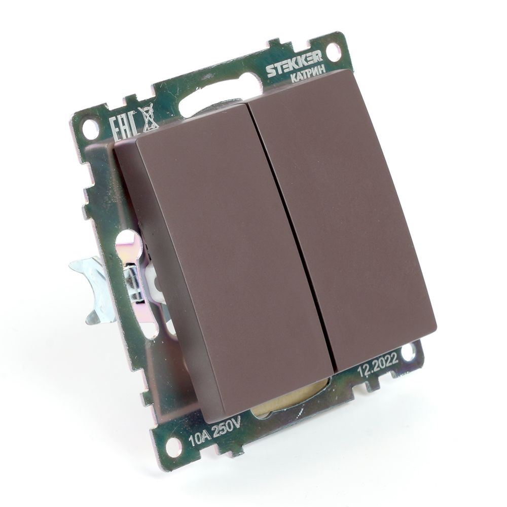 Выключатели двухклавишный STEKKER GLS10-7104-04, серия Катрин тип установки - скрытый, размер изделия 72*72*35мм., цвет шоколад, материал изделия поликарбонат, латунь. Номинальное напряжение 250 , номинальный ток 10А, IP20