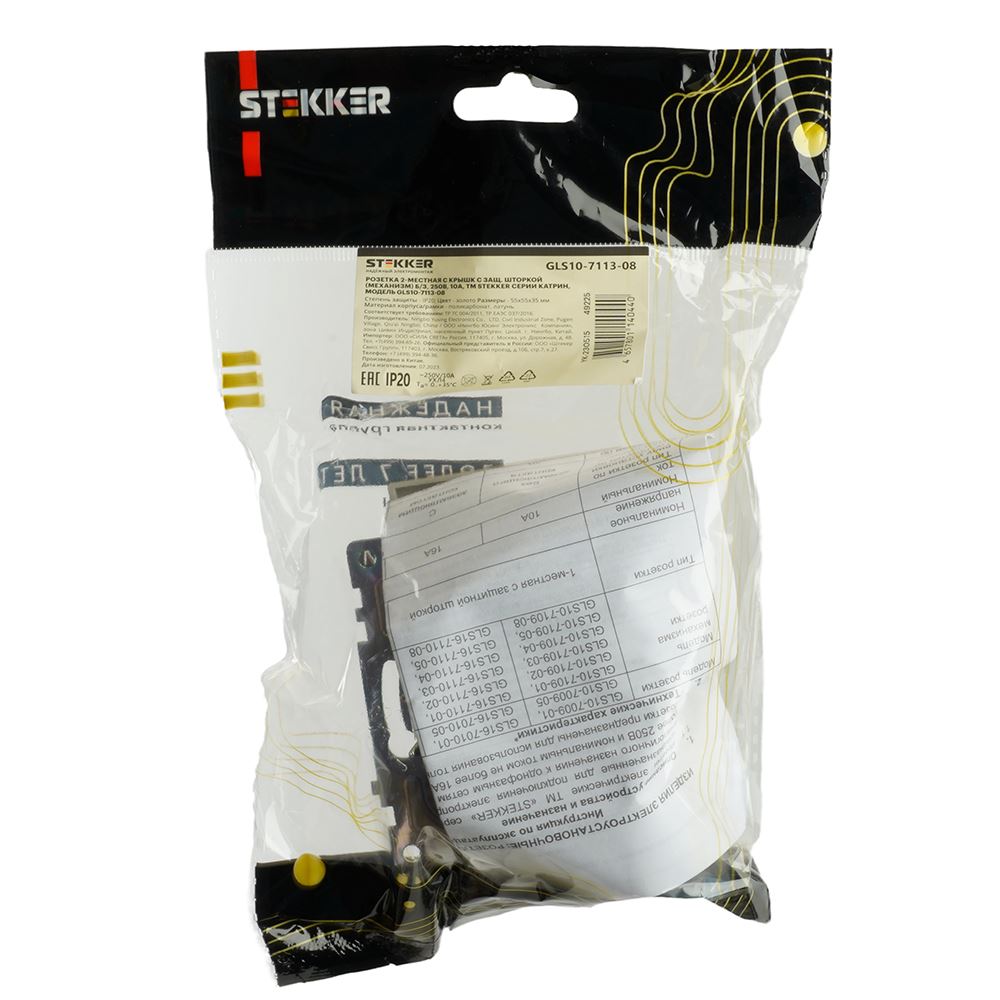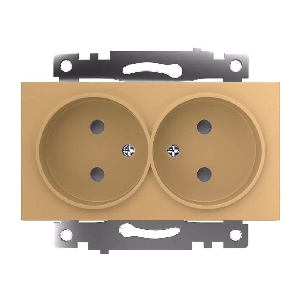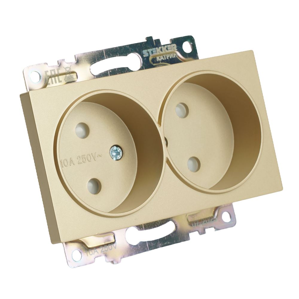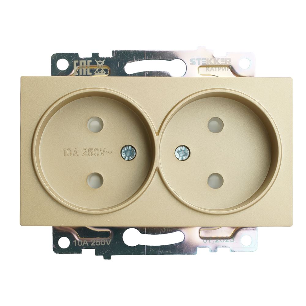 Розетка STEKKER GLS10-7113-08 на 2 гнездо, с заземлением. Материал: поликарбонат, латунь, цвет золото, размер 91*72*34мм. Номинальное напряжение 250, номинальный ток 10А, диапазон рабочих температур 0..+35°C, IP20