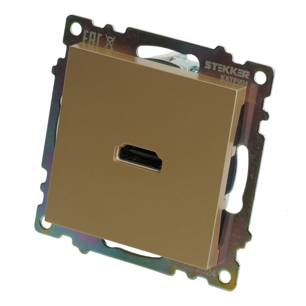 Розетка STEKKER GLS00-7118-08 (стандарт : HDMI 2.1¶Тип разъема : HDMI type A¶полоса пропускания видео-сигнала: 3 Ггц¶разрешение видео-сигнала : поддерживает разрешения до 4K (3840x2160 при 60 Гц)¶скорость передачи данных : 6 Гбит/сек¶) на 1 гнездо, -. Материал: поликарбонат, латунь, цвет золото, размер 72*72*35мм. Номинальное напряжение -, номинальный ток 1A, диапазон рабочих температур 0..+35°C, IP20