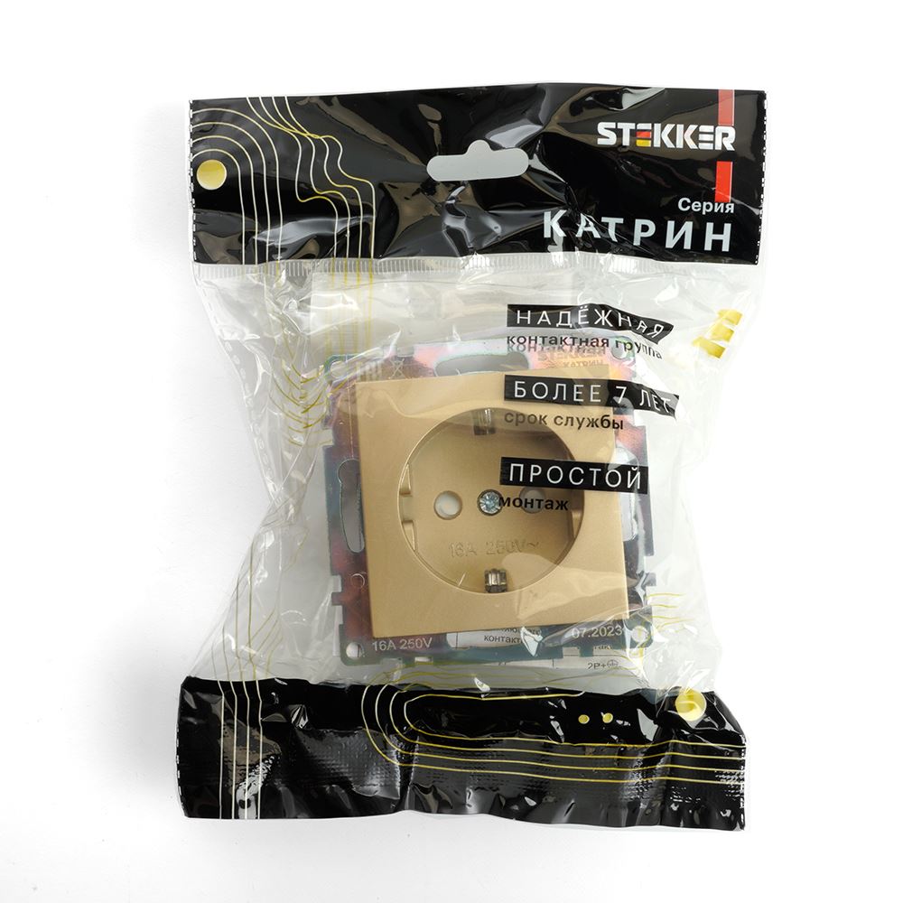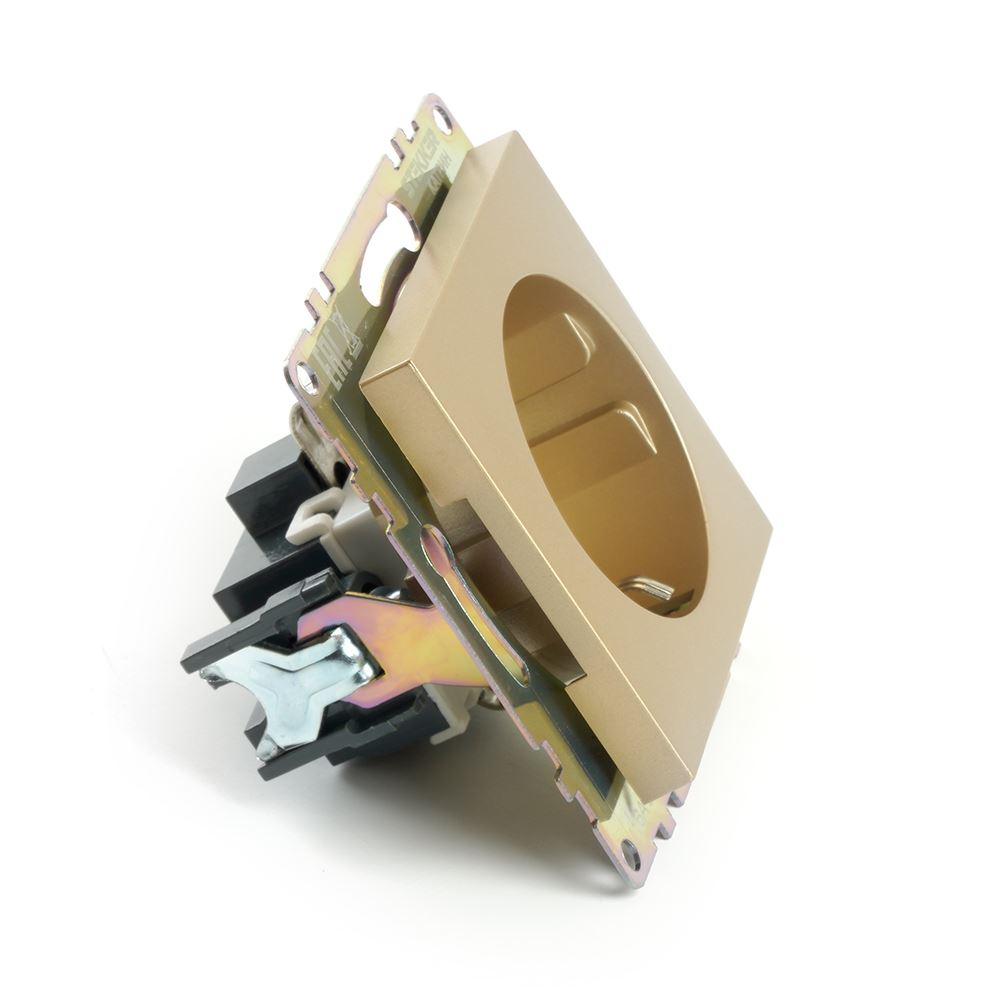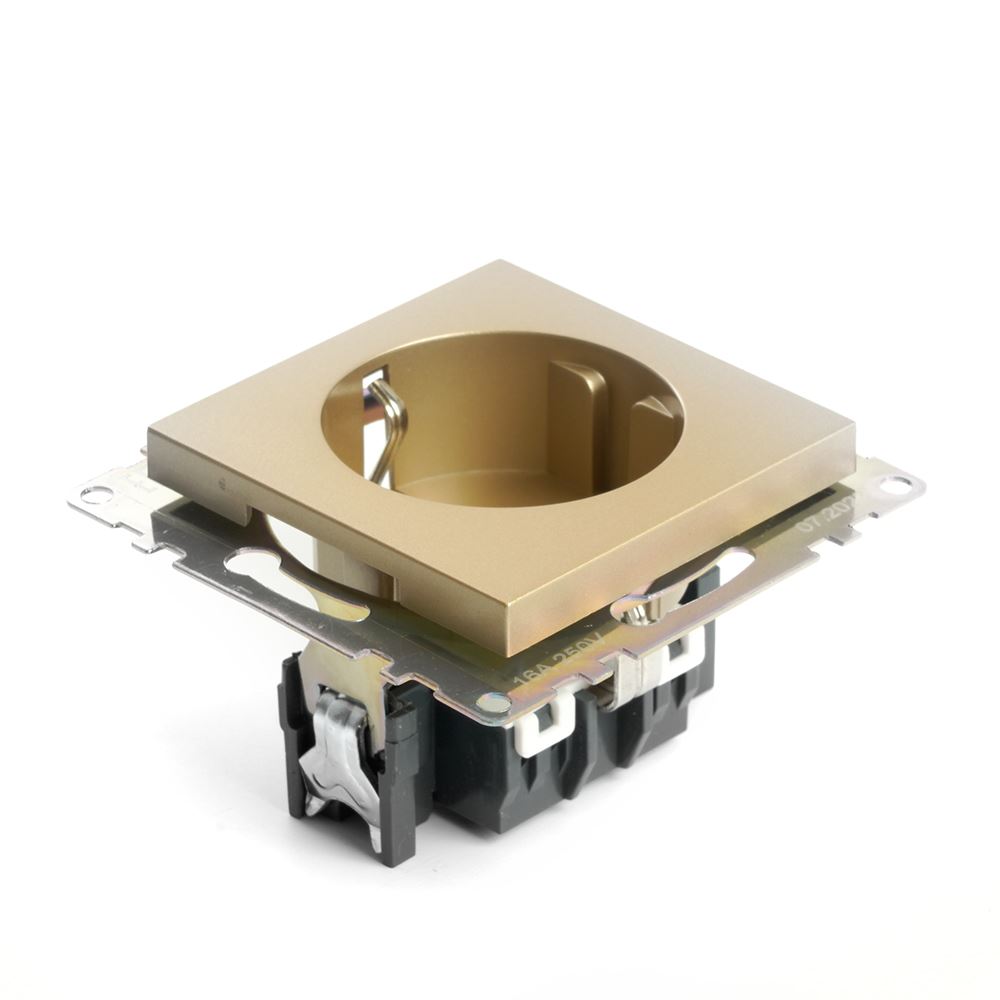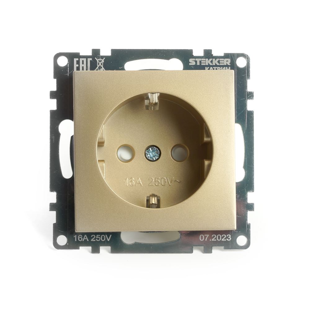 Розетка STEKKER GLS16-7110-08 на 1 гнездо, с заземлением. Материал: поликарбонат, латунь, цвет золото, размер 72*72*43мм. Номинальное напряжение 250, номинальный ток 16А, диапазон рабочих температур 0..+35°C, IP20