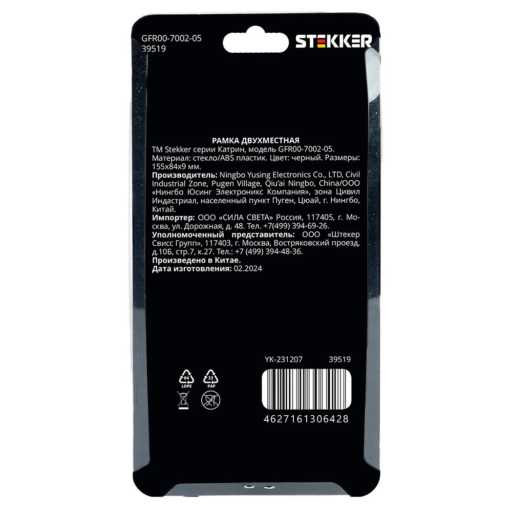 Рамка STEKKER GFR00-7002-05 на гнездо, , . Материал: Закаленное стекло/ABS пластик, цвет черный, размер 155*84*9мм. Номинальное напряжение , номинальный ток , диапазон рабочих температур ,