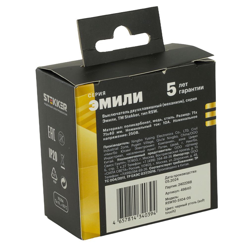 Выключатели двухклавишный STEKKER RSW10-5111-05, серия Эмили тип установки - скрытый, размер изделия 71*71*40мм., цвет черный уголь, soft touch, материал изделия поликарбонат, латунь, сталь. Номинальное напряжение 250 , номинальный ток 10А, 20