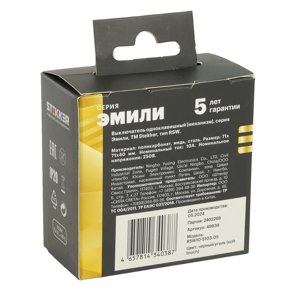 Выключатели одноклавишный STEKKER RSW10-5103-05, серия Эмили тип установки - скрытый, размер изделия 71*71*40мм., цвет черный уголь, soft touch, материал изделия поликарбонат, латунь, сталь. Номинальное напряжение 250 , номинальный ток 10А, 20