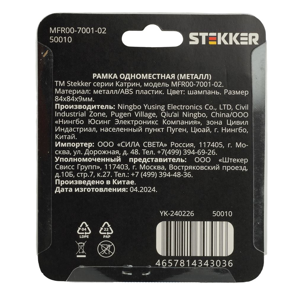 Рамка STEKKER MFR00-7001-02 на гнездо, , . Материал: металл/ABS пластик, цвет шампань, размер 84*84*9мм. Номинальное напряжение , номинальный ток , диапазон рабочих температур ,