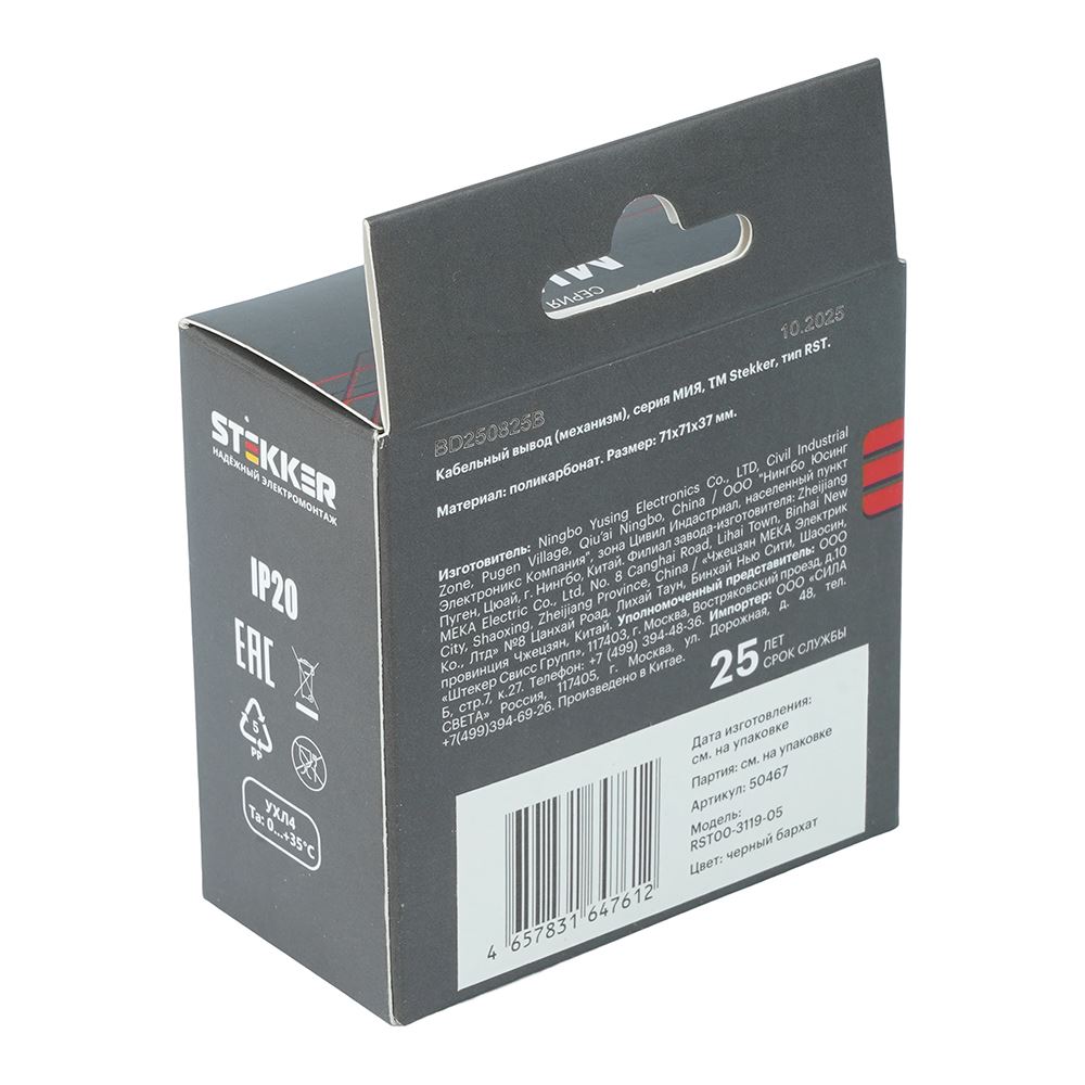 Розетка STEKKER RST00-3119-05 (срок службы 25 лет) на - гнездо, -, -. Материал: поликарбонат, цвет черный бархат, размер 71*71*38мм. Номинальное напряжение -, номинальный ток -, диапазон рабочих температур 0..+35°C, IP20