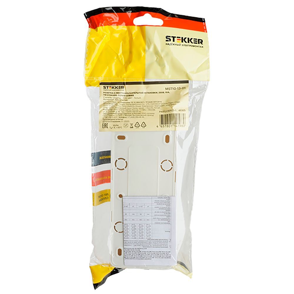Розетка STEKKER MST10-13-01 на 3 гнездо, без заземления. Материал: ABS пластик, цвет белый, размер 148*64*32мм. Номинальное напряжение 250, номинальный ток 10А, диапазон рабочих температур 0..+35°C, IP20