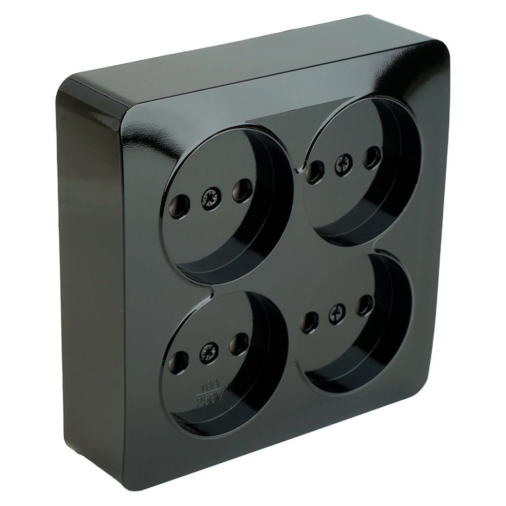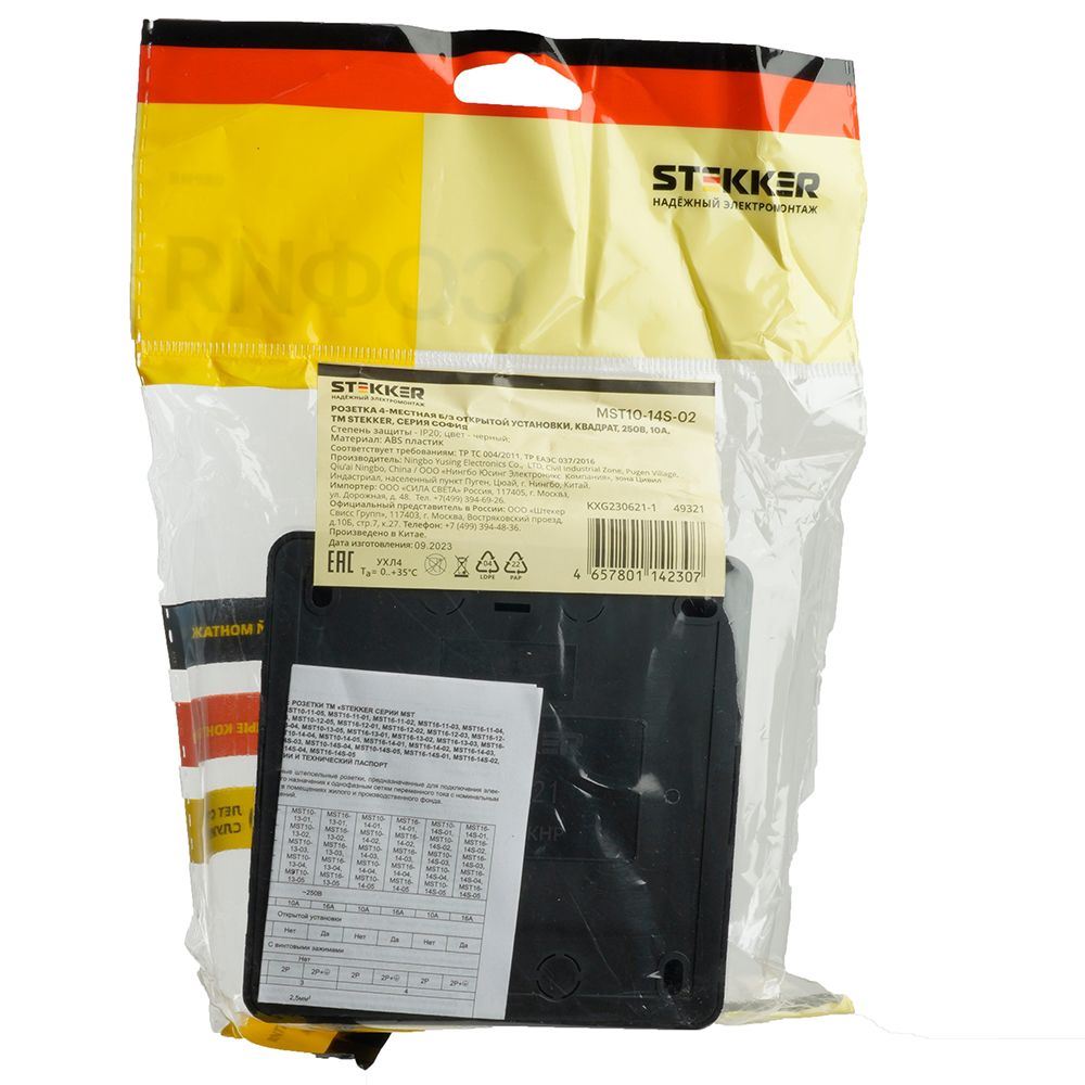 Розетка STEKKER MST10-14S-02 на 4 гнездо, без заземления. Материал: ABS пластик, цвет черный, размер 103*103*32мм. Номинальное напряжение 250, номинальный ток 10А, диапазон рабочих температур 0..+35°C, IP20