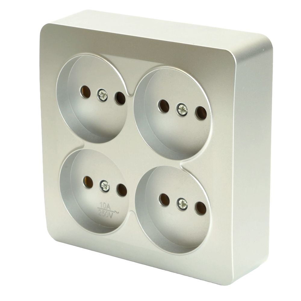 Розетка STEKKER MST10-14S-03 на 4 гнездо, без заземления. Материал: ABS пластик, цвет серебро, размер 103*103*32мм. Номинальное напряжение 250, номинальный ток 10А, диапазон рабочих температур 0..+35°C, IP20