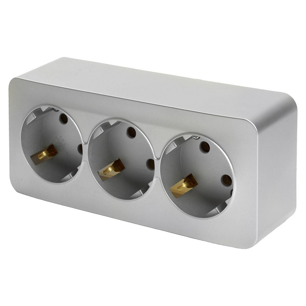 Розетка STEKKER MST16-13-03 на 3 гнездо, с заземлением. Материал: ABS пластик, цвет серебро, размер 149*64*42мм. Номинальное напряжение 250, номинальный ток 16А, диапазон рабочих температур 0..+35°C, IP20