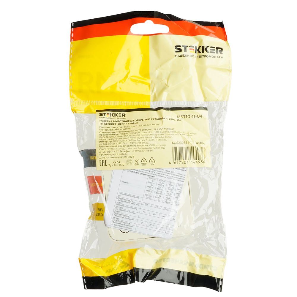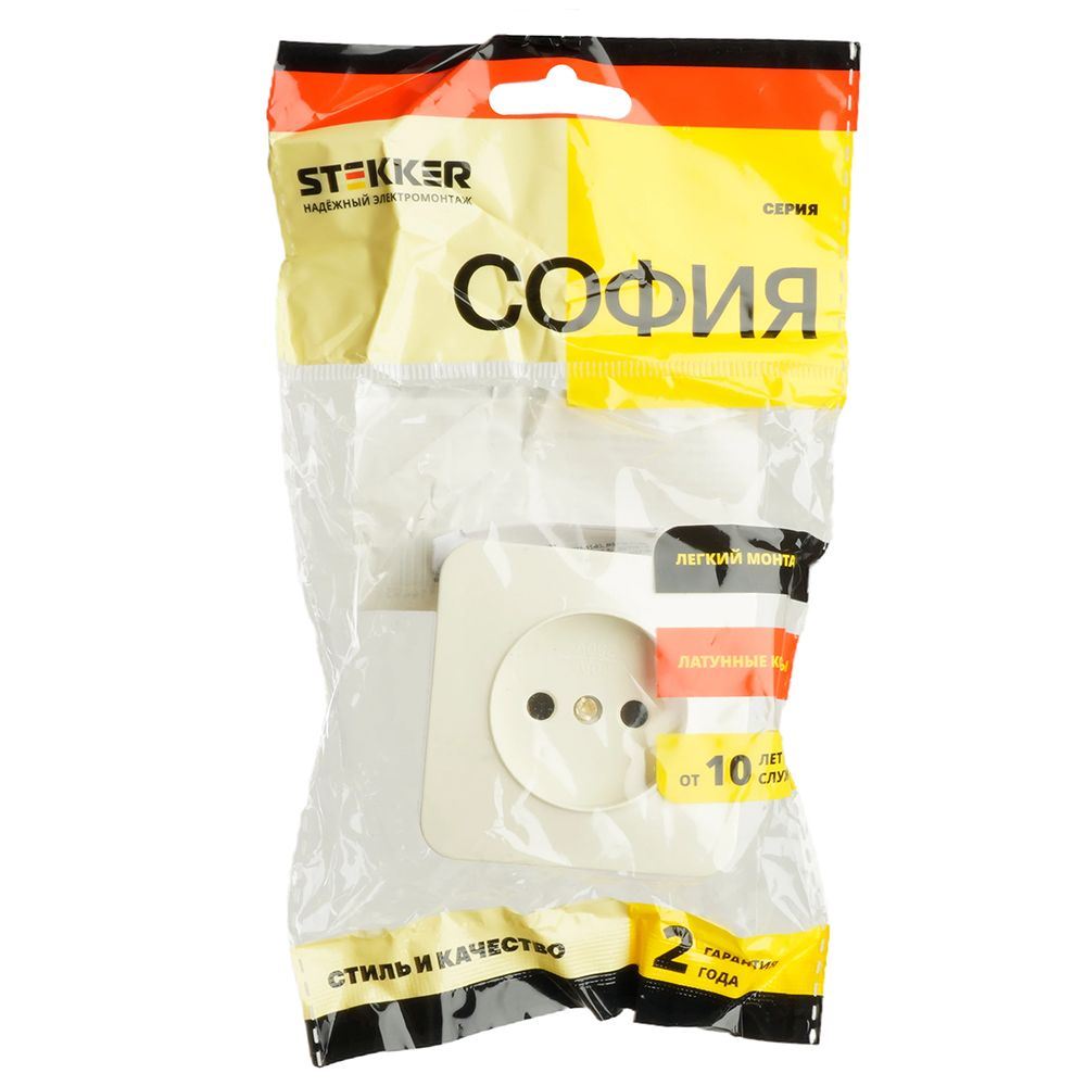 Розетка STEKKER MST10-11-04 на 1 гнездо, без заземления. Материал: ABS пластик, цвет слоновая кость, размер 64*64*31мм. Номинальное напряжение 250, номинальный ток 10А, диапазон рабочих температур 0..+35°C, IP20