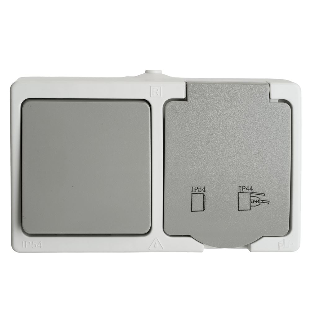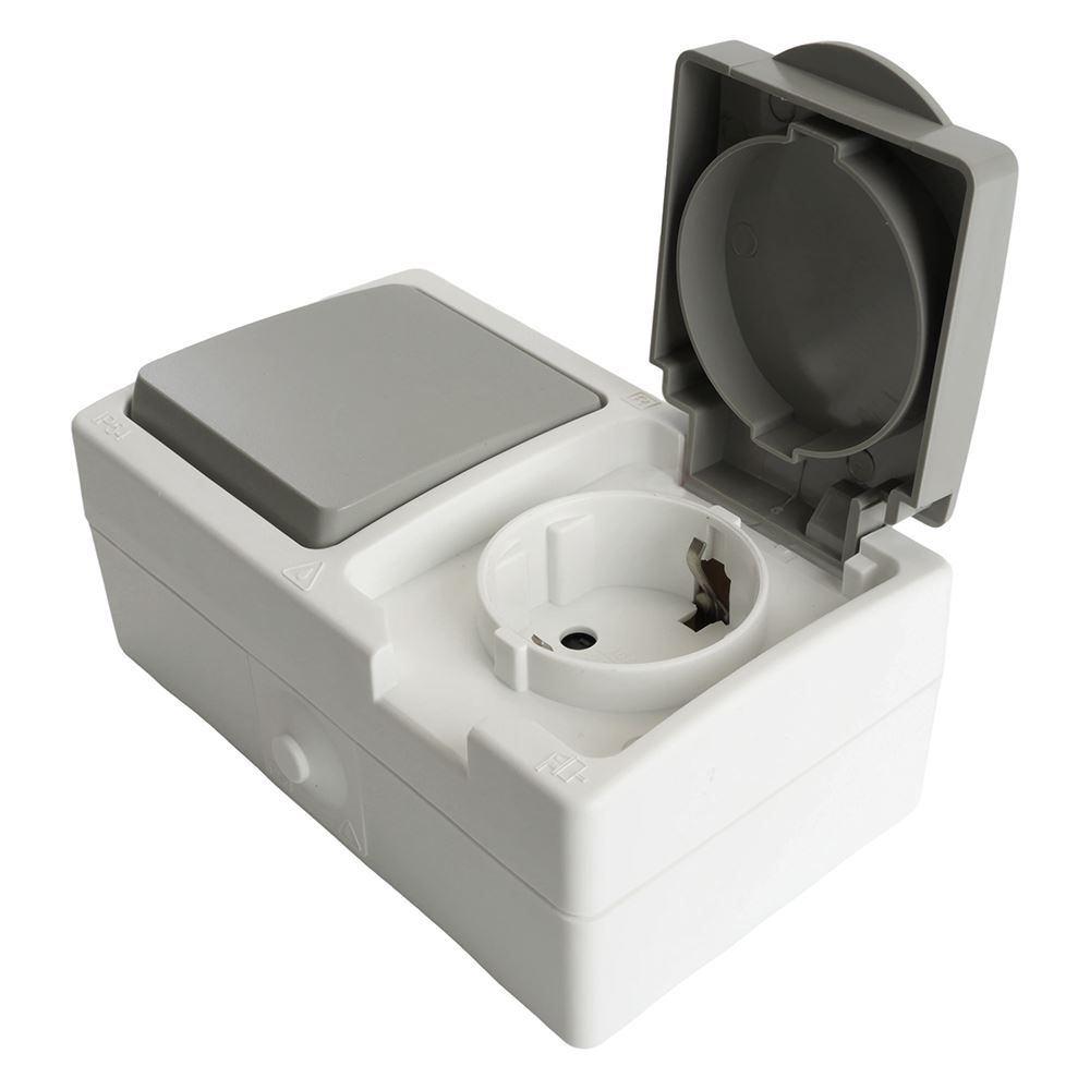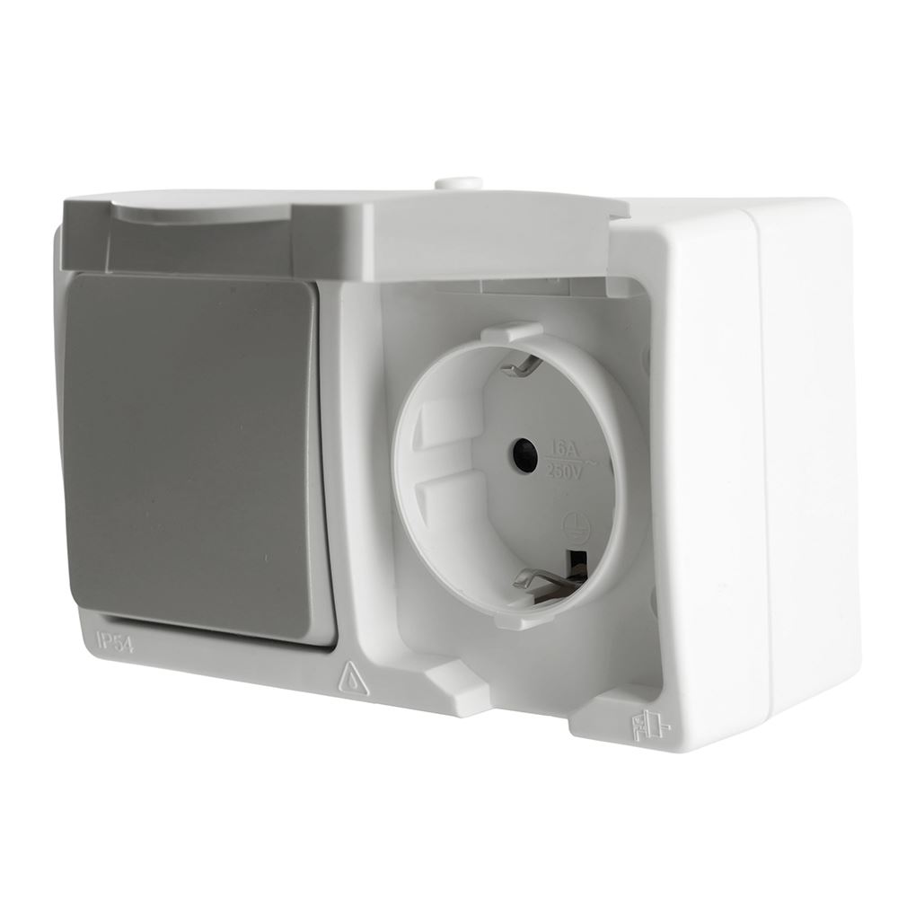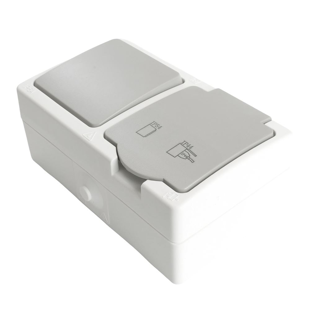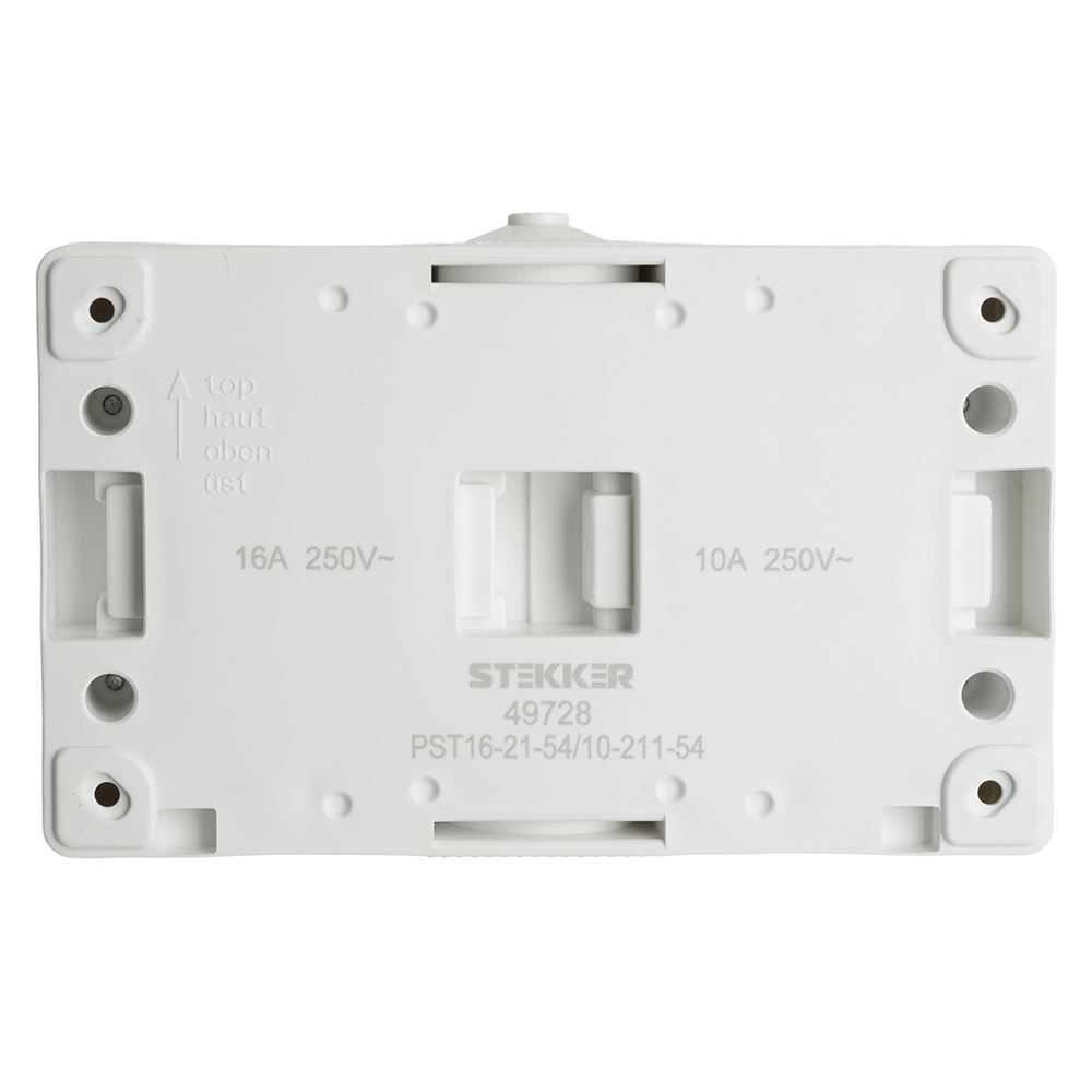 Розетка STEKKER PST16-21-54/10-211-54 (блок с выключателем одноклавишным однополюсным,для двух цепей с общим вводом ,раст-ие между монтажн. отверстиями: по гориз. - 113мм, по вертик.- 65мм, с защитными шторками.) на 1 гнездо, с крышкой, с заземлением. Материал: Полипропилен, ABS пластик, латунь, цвет белый+серый, размер 125*83*53мм. Номинальное напряжение 250, номинальный ток 16А, диапазон рабочих температур 0..+35°C, IP54