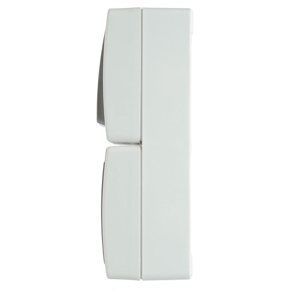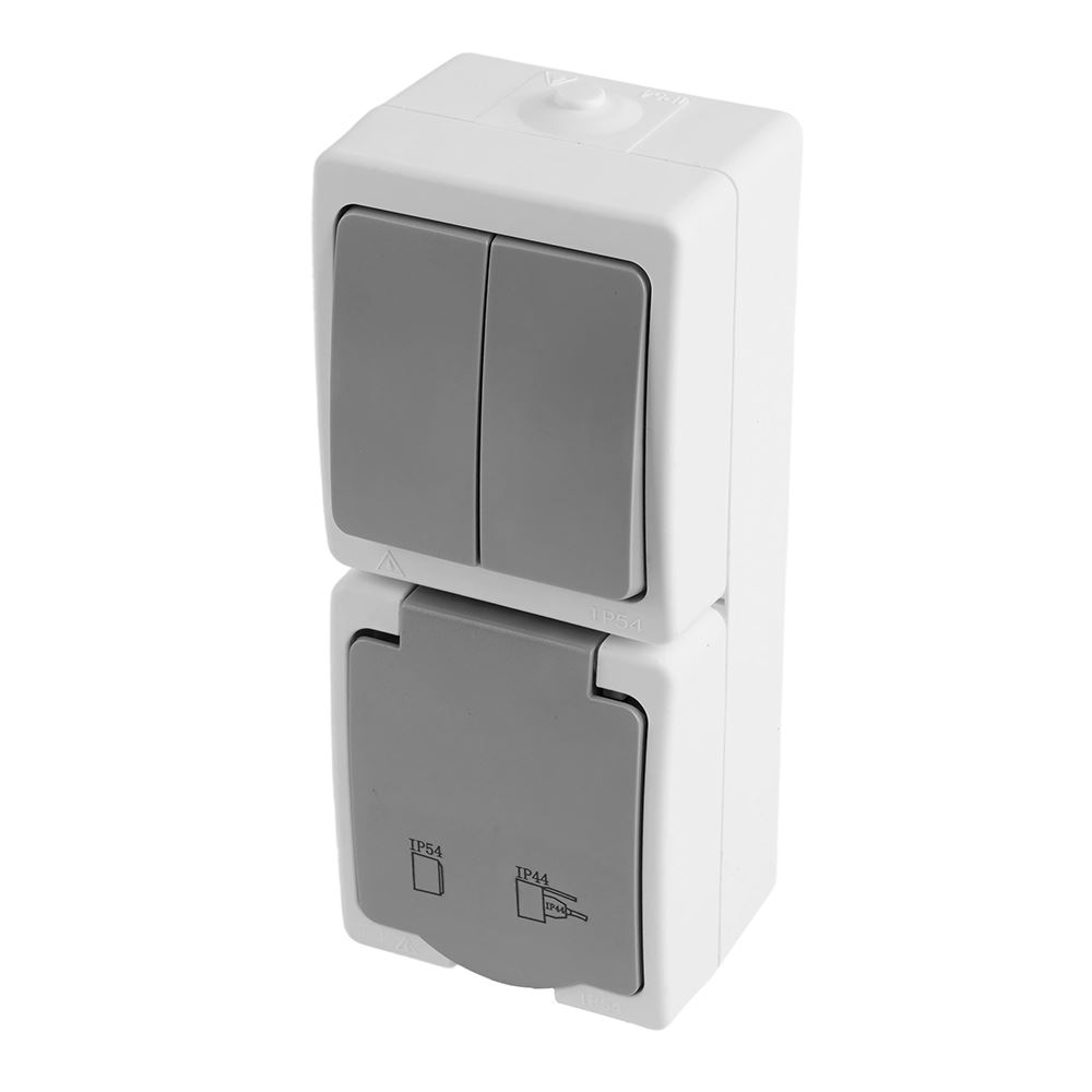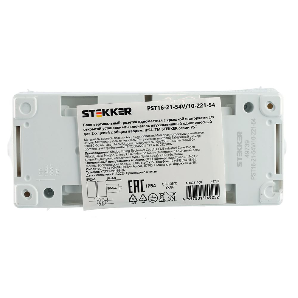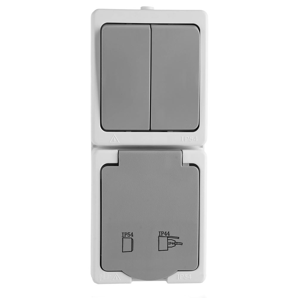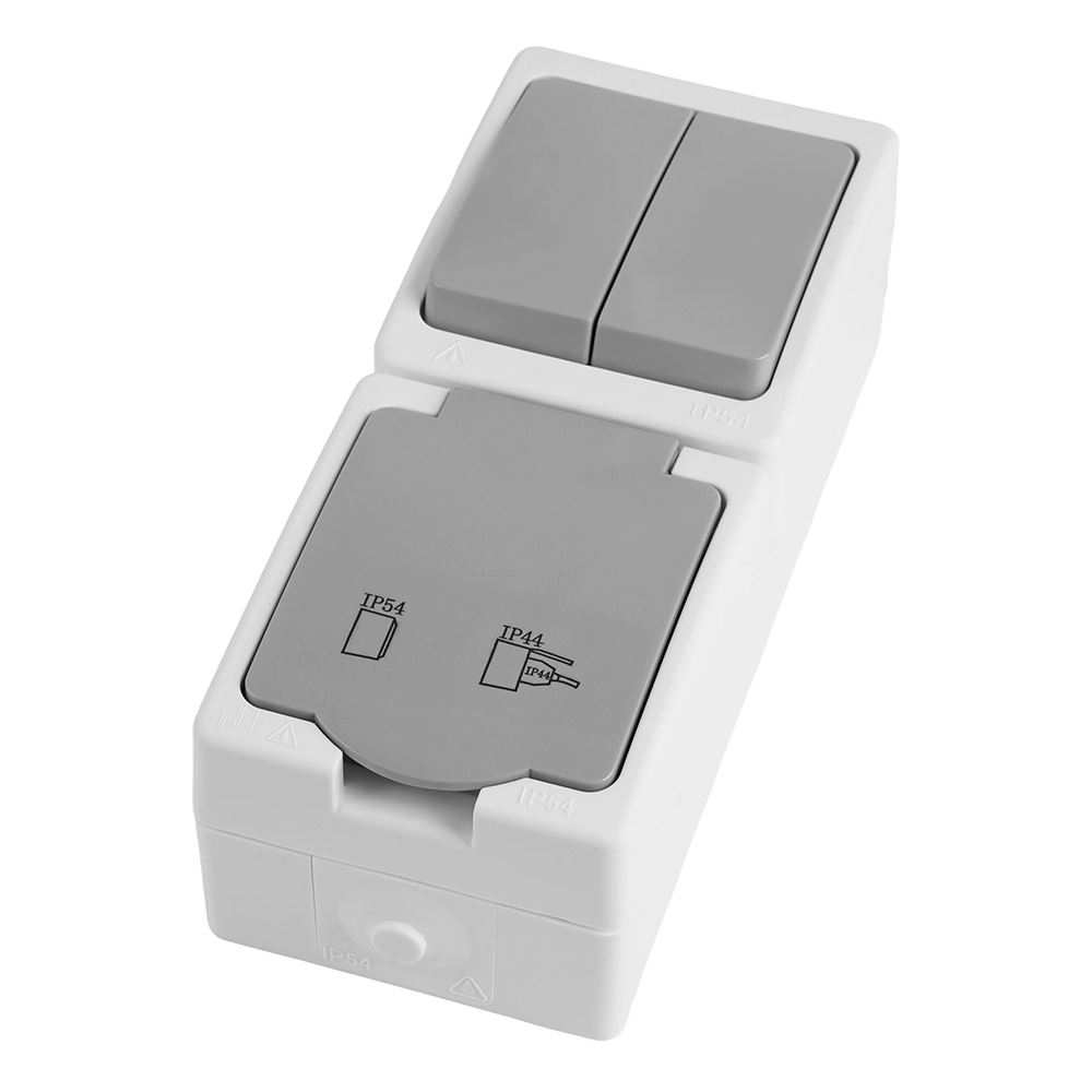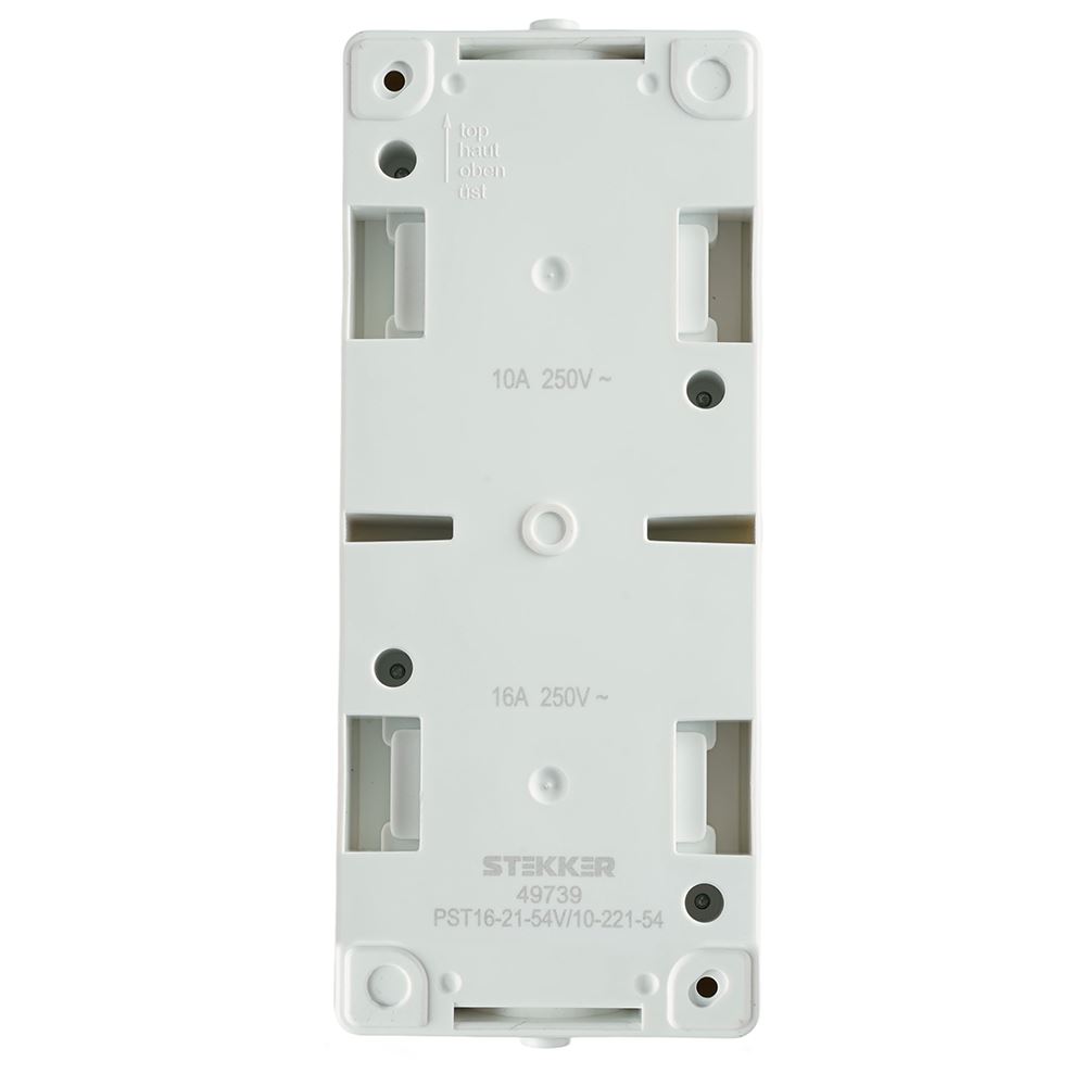 Розетка STEKKER PST16-21-54V/10-221-54 (блок с выключателем двухклав., однополюсным для двух цепей с общим вводом, расстояние между монтажн. отвер-ми: по гориз. - 113мм, по вертик.- 65мм) на 1 гнездо, с крышкой, с заземлением. Материал: Полипропилен, ABS пластик, цвет белый+серый, размер 83*125*53мм. Номинальное напряжение 250, номинальный ток 16А, диапазон рабочих температур 0..+35°C, IP54