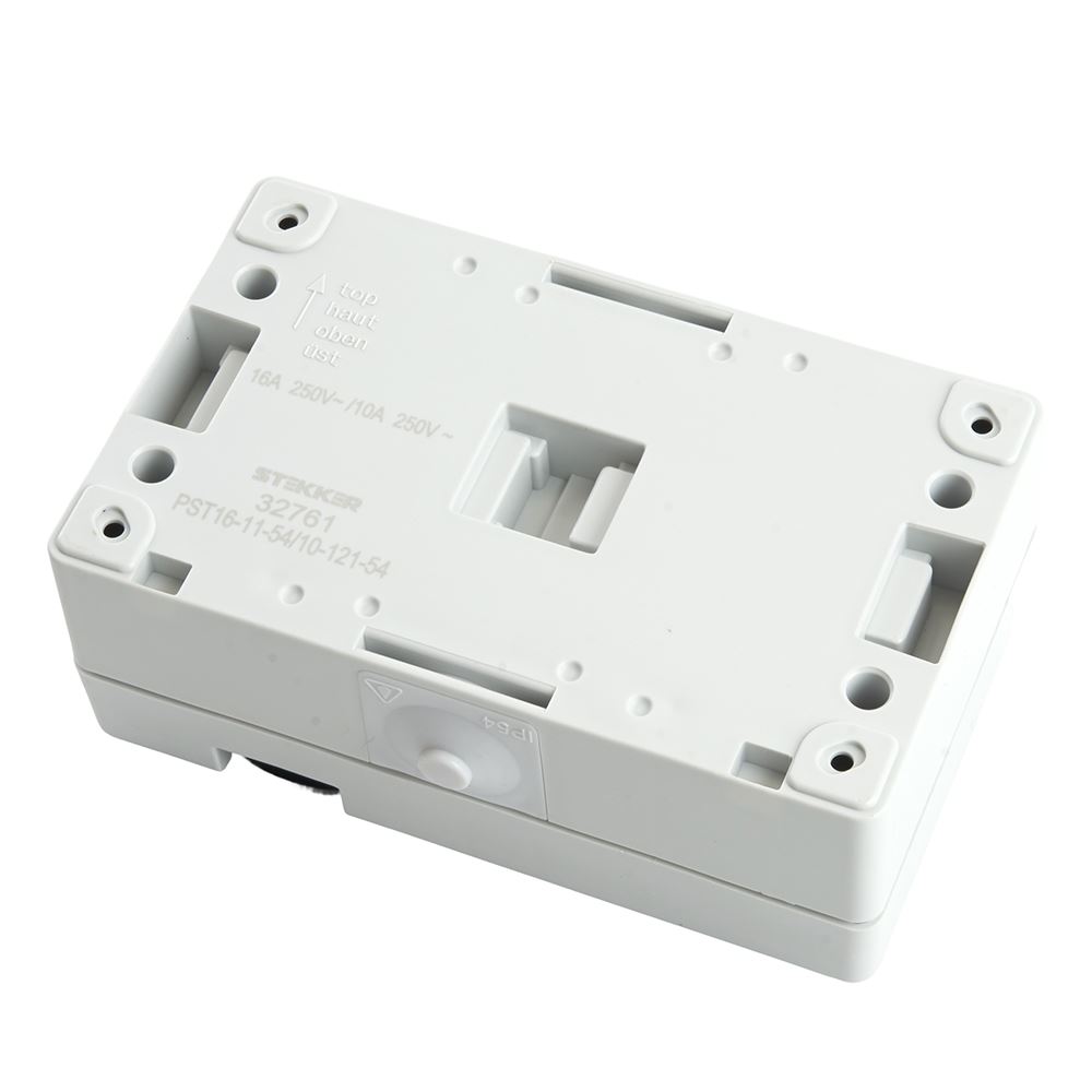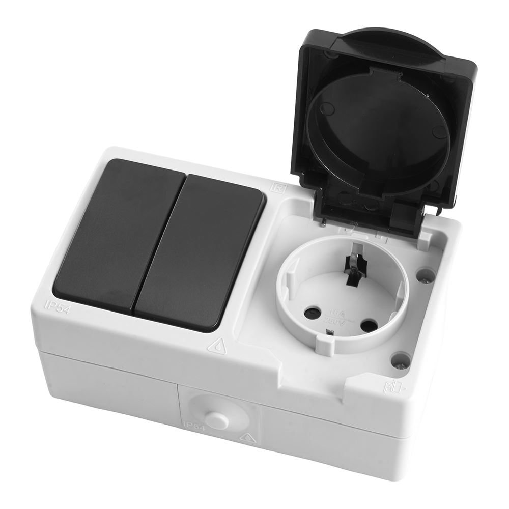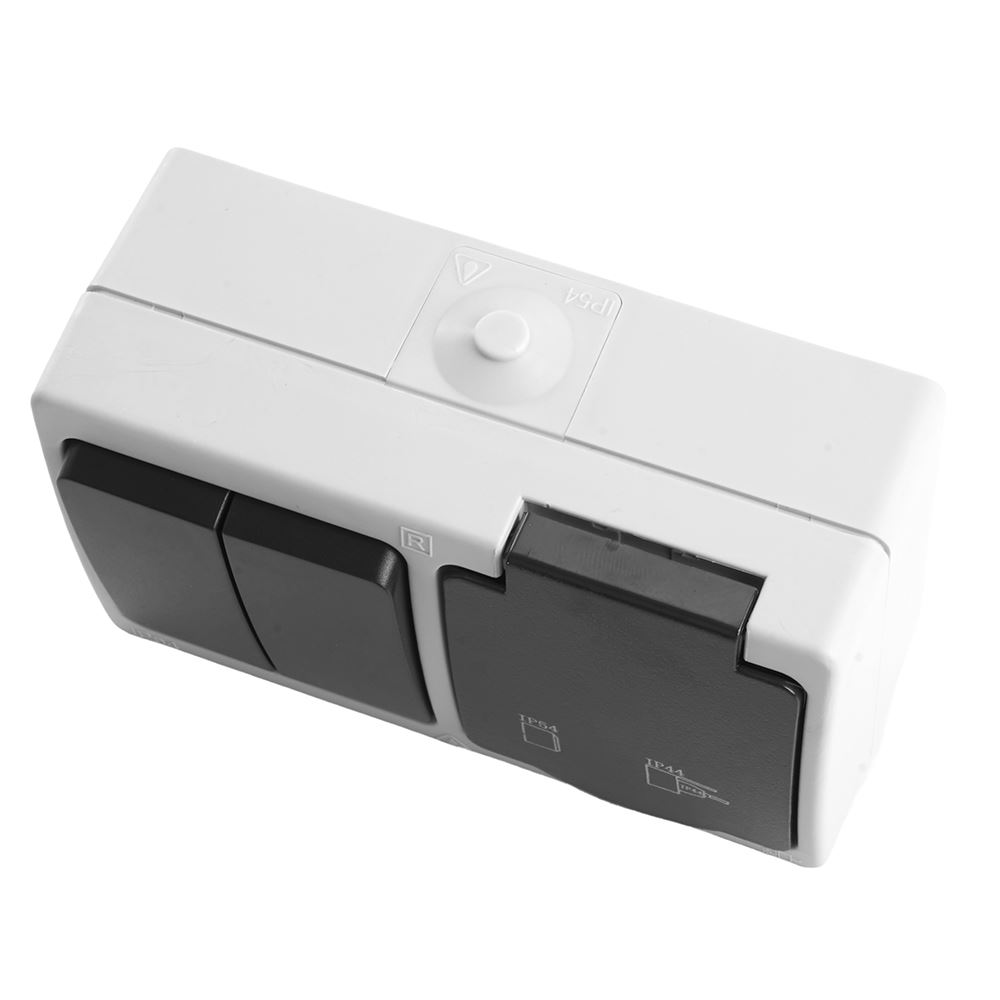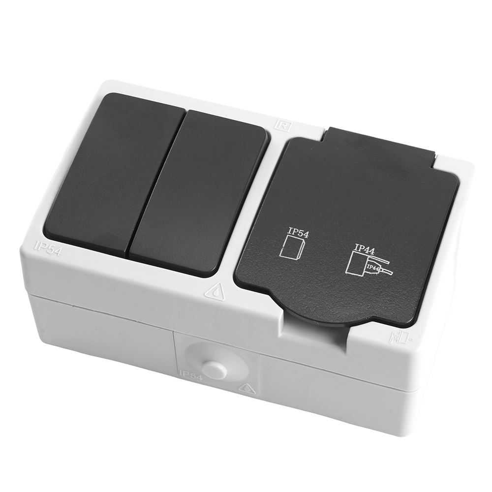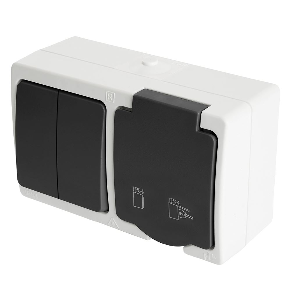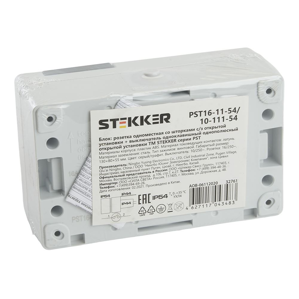 Розетка STEKKER PST16-11-54/10-121-54 (блок с выключателем двухклав., однополюсным для двух цепей с общим вводом, расстояние между монтажн. отвер-ми: по гориз. - 113мм, по вертик.- 65мм) на 1 гнездо, с крышкой, с заземлением. Материал: Полипропилен, ABS пластик, цвет серый-графит, размер 125*83*53мм. Номинальное напряжение 250, номинальный ток 16А, диапазон рабочих температур 0..+35°C, IP54