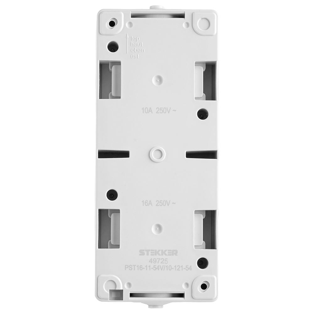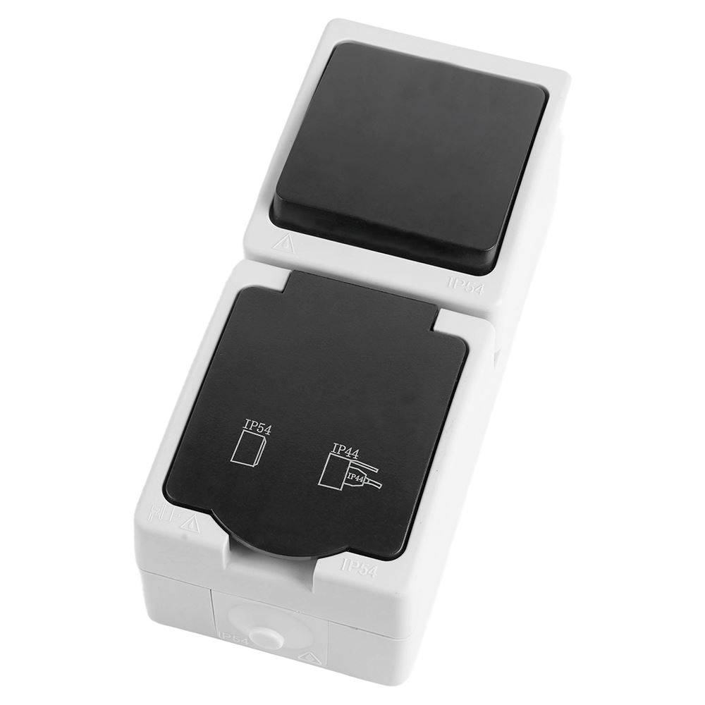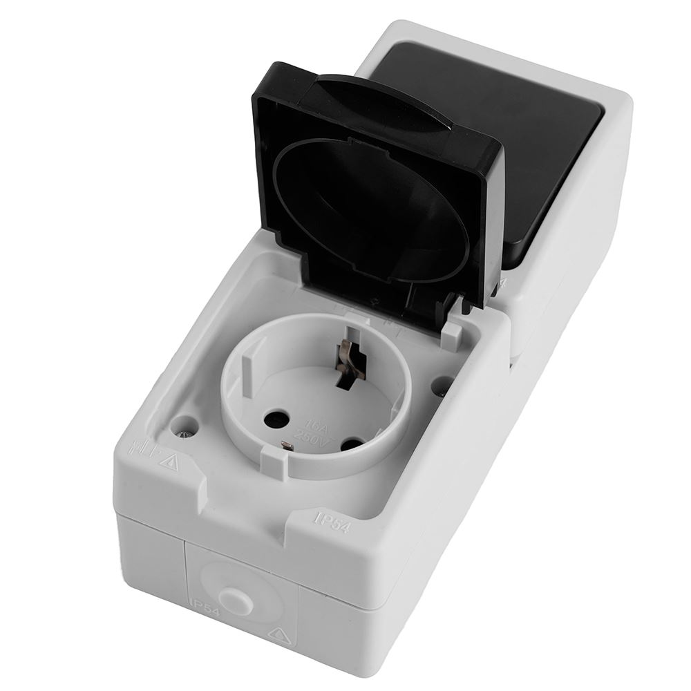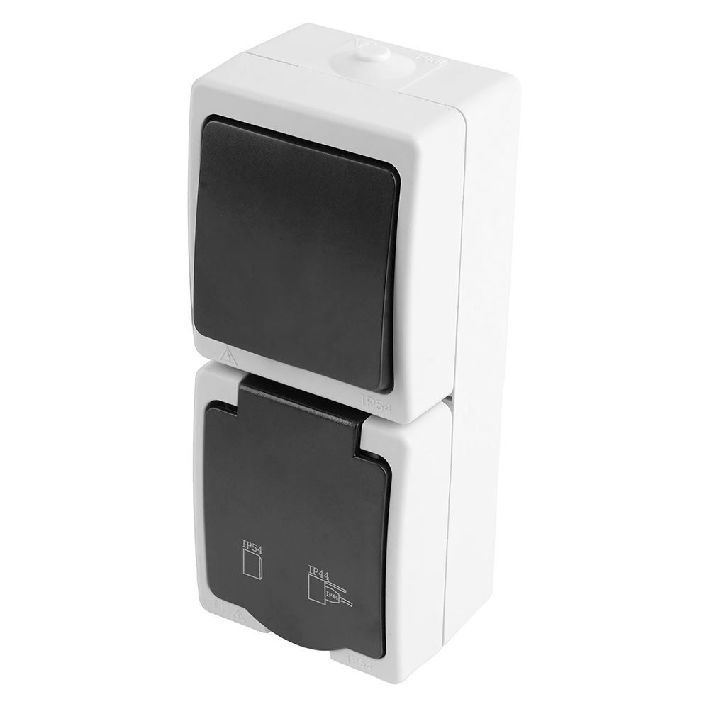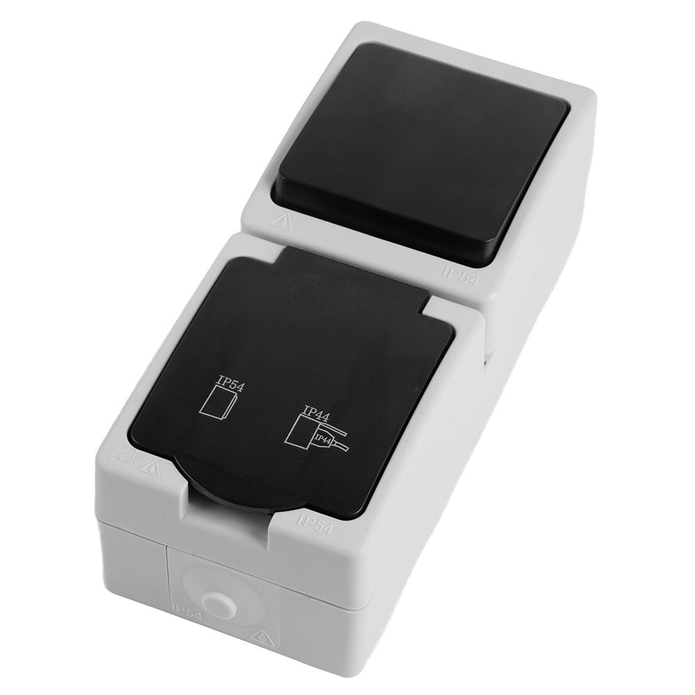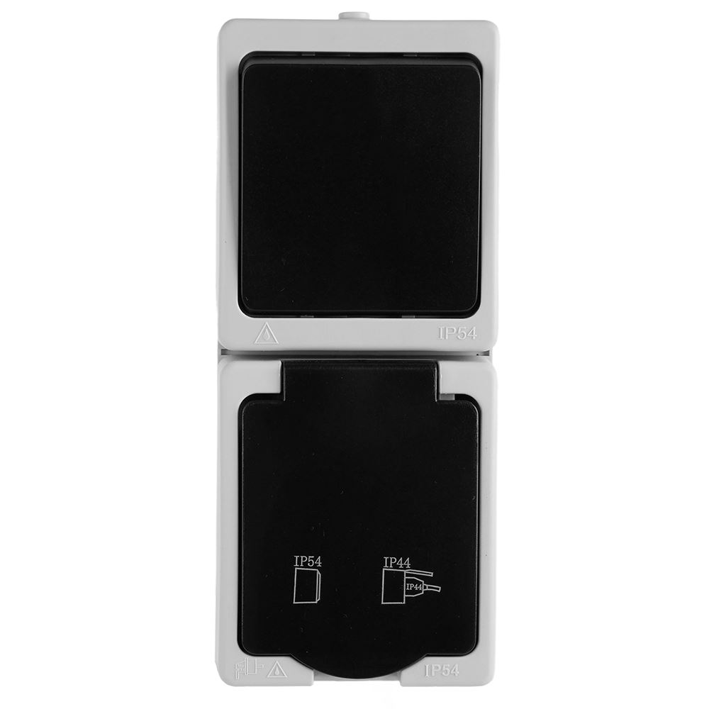 Розетка STEKKER PST16-11-54V/10-111-54 (блок с выключателем одноклавишным однополюсным,для двух цепей с общим вводом ,раст-ие между монтажн. отверстиями: по гориз. - 113мм, по вертик.- 65мм, с защитными шторками.) на 1 гнездо, с крышкой, с заземлением. Материал: Полипропилен, ABS пластик, латунь, цвет серый-графит, размер 83*125*53мм. Номинальное напряжение 250, номинальный ток 16А, диапазон рабочих температур 0..+35°C, IP54